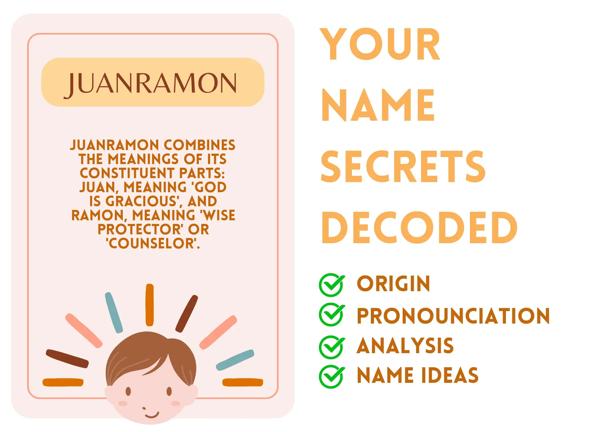 At the core of Juanramon's identity is a beautiful blend of meanings. Juan stands for 'God is gracious,' and Ramon translates to 'wise protector' or 'counselor.' This means Juanramon naturally radiates kindness and care, like a cozy campfire that draws people in for warmth and stories. You might find Juanramon volunteering to help others, offering sage advice to friends struggling with life decisions, or simply being that reliable buddy who lends a listening ear. When he steps into a room, his gracious heart shines bright, making everyone feel valued and heard.