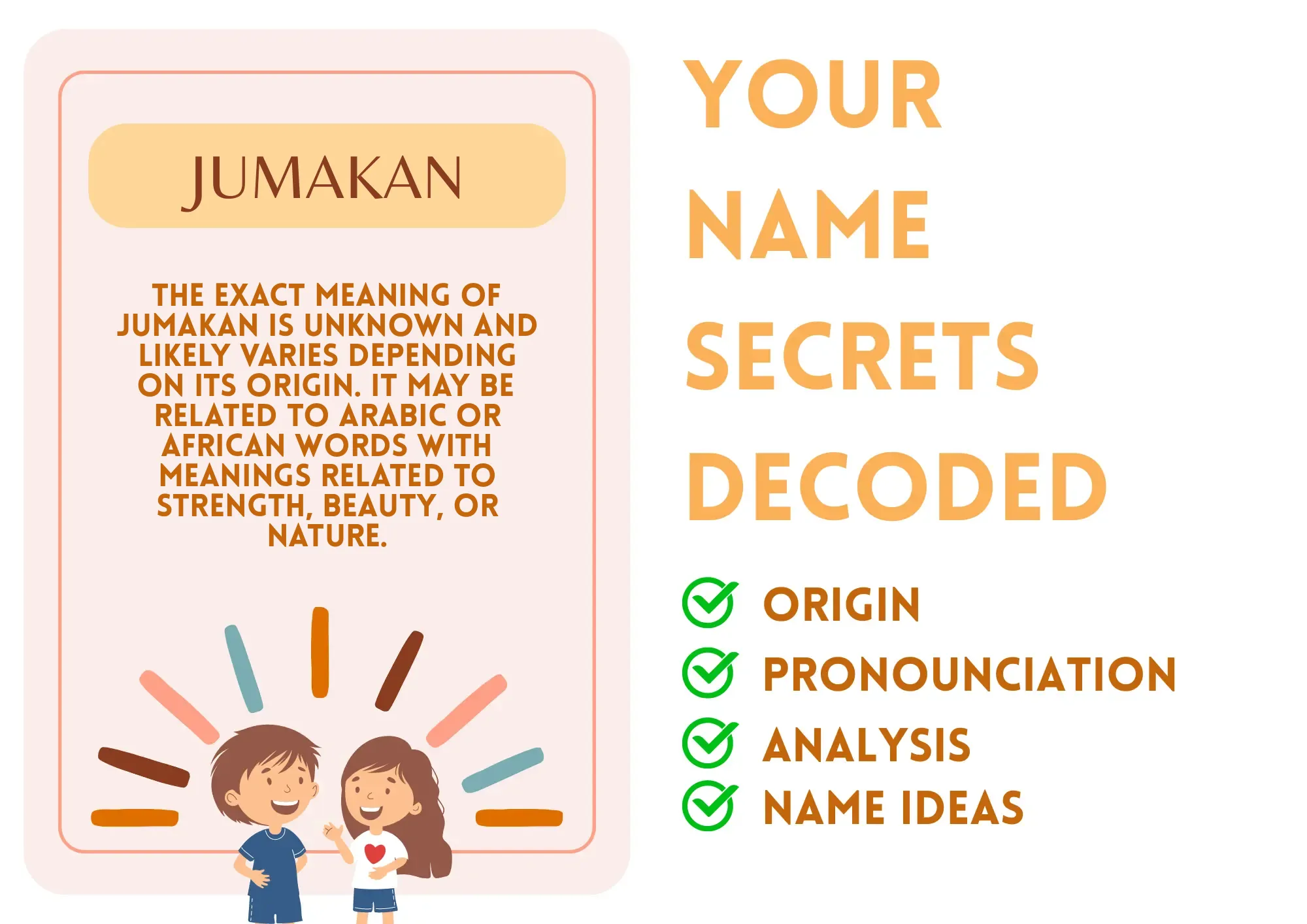 Jumakan is a name of uncertain origin and meaning. It is likely of African or Arabic origin, though its specific etymology is unclear. The name is not widely used and may be considered unique.