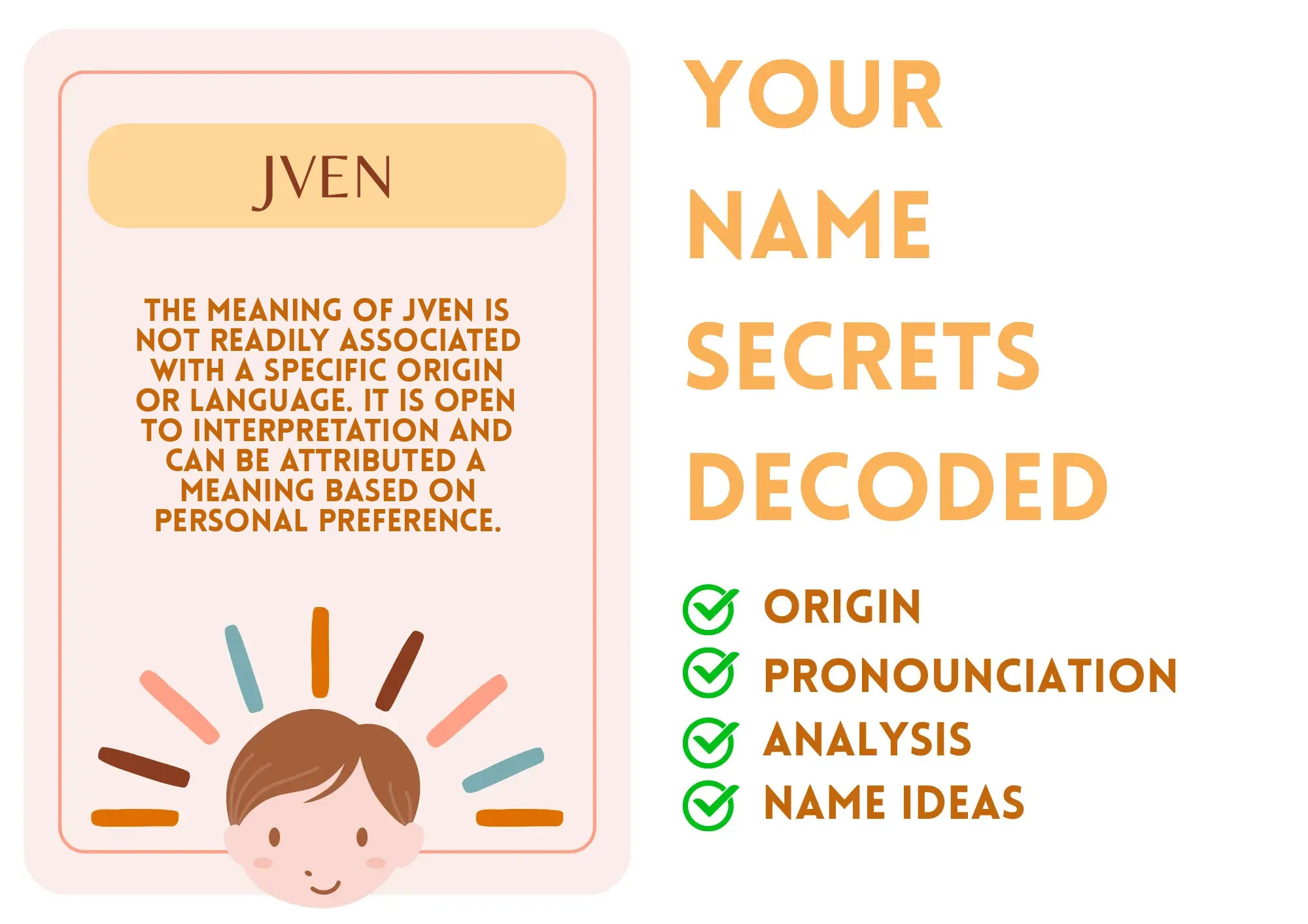 Your name, Jven, is like a blank canvas ready for your creative touch. It doesn’t shout its meaning, which means you have the freedom to shape what it represents in your life. This trait encourages you to embrace your individuality, allowing you to redefine what success means on your own terms. Think of it as being given a magical paintbrush: you can paint your name with the colors of your achievements, your passions, and all the adventures you embark on, embodying whatever meaning resonates with you most!
