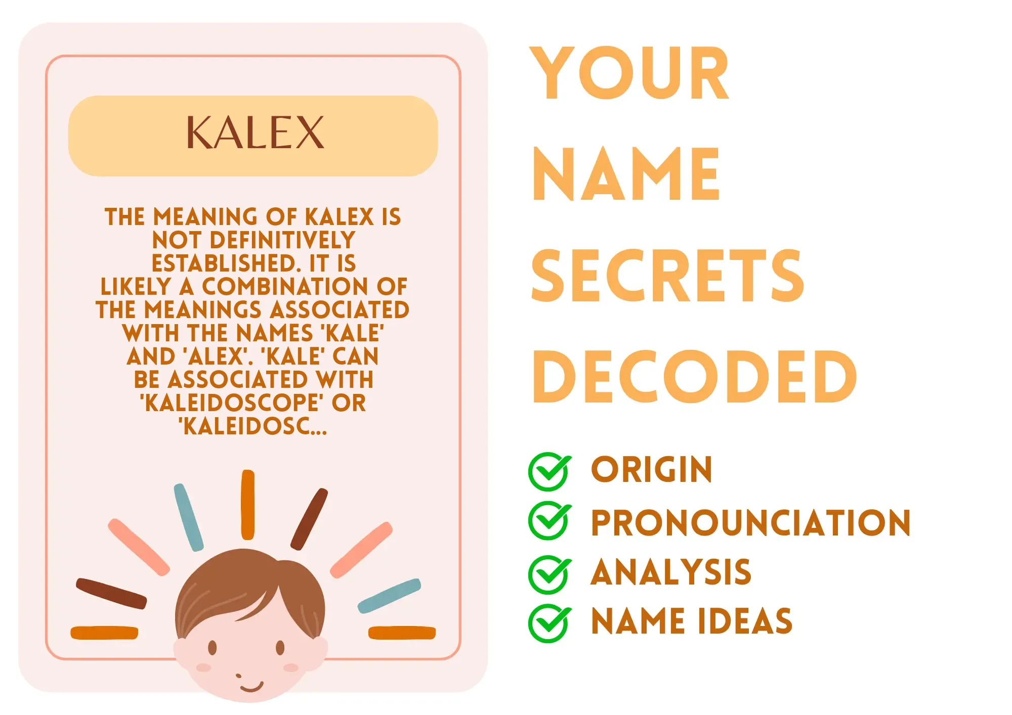 Meaning: The meaning of Kalex is not definitively established. It is likely a combination of the meanings associated with the names 'Kale' and 'Alex'. 'Kale' can be associated with 'kaleidoscope' or 'kaleidoscopic', signifying vibrancy and diversity, while 'Alex' means 'defender of mankind' or 'helper of mankind'.
