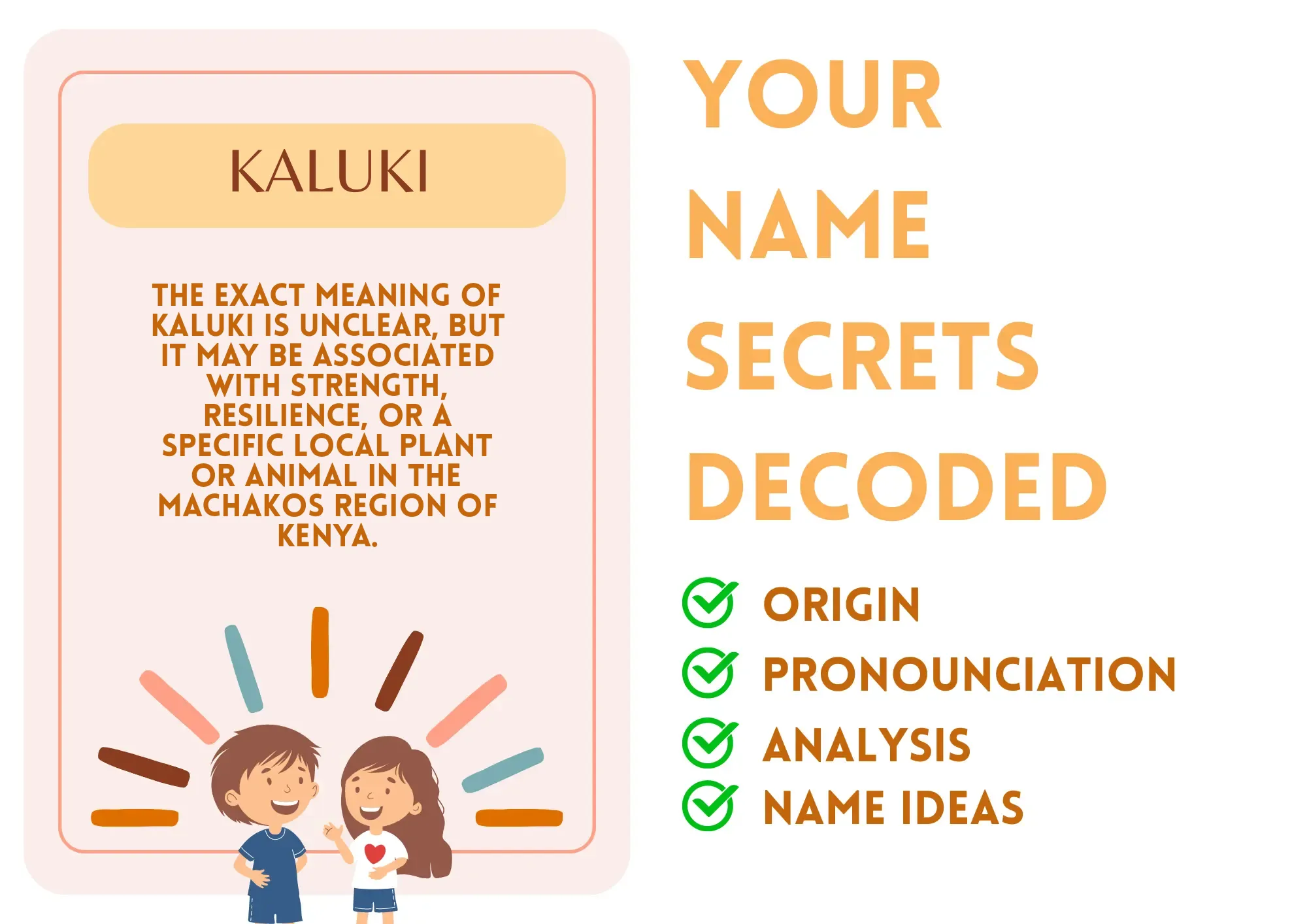 Meaning: The exact meaning of Kaluki is unclear, but it may be associated with strength, resilience, or a specific local plant or animal in the Machakos region of Kenya.