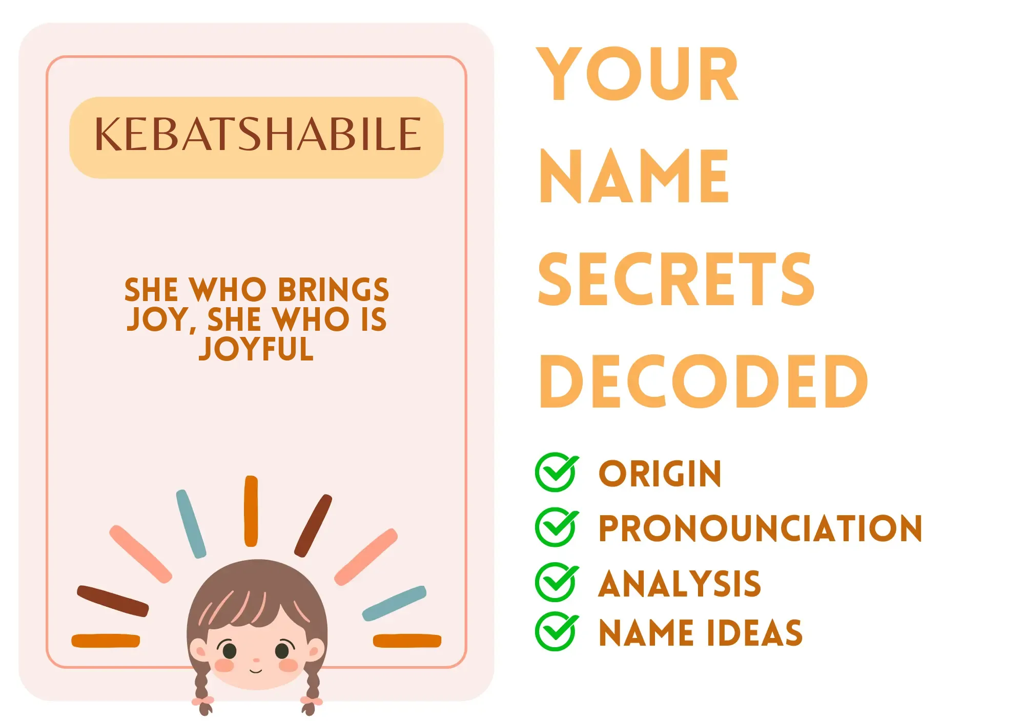 Imagine walking into a room and lighting it up just by being there. That’s the kind of magic Kebatshabile brings with her name, which means “She who brings joy.” Her name isn’t just a label; it’s like a badge of happiness she wears proudly, inviting everyone around her to share in the fun and the laughter. Kebatshabile is the friend who effortlessly pulls you into her world of smiles and great vibes, making life feel brighter and fuller. Whether it’s a quiet moment with close pals or a big celebration, her infectious joy stands out. And despite the occasional struggle with pronunciation, once you say it right, it feels like unlocking a cheerful language all its own!