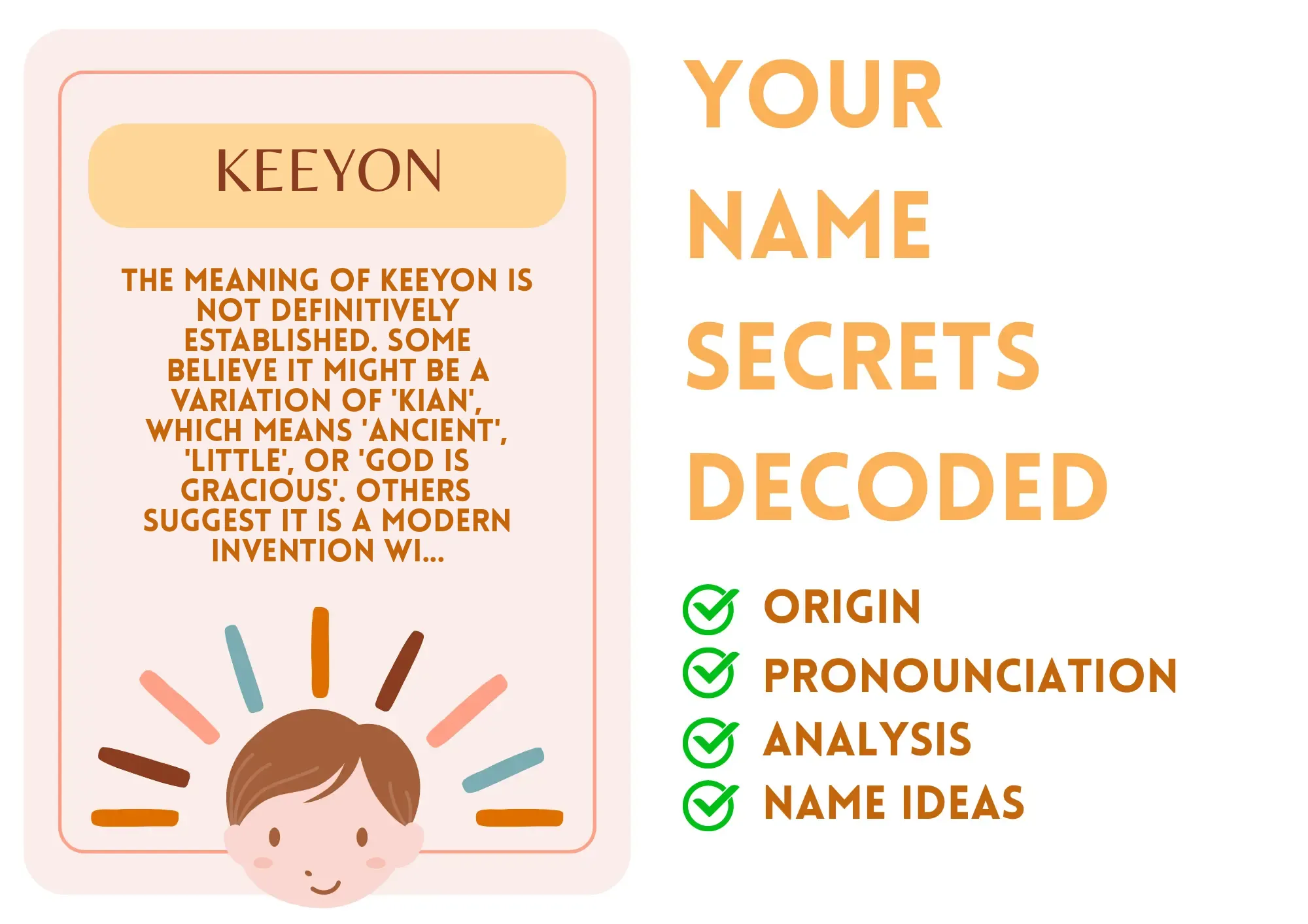 Keeyon blends both masculine and feminine traits perfectly, like a well-mixed smoothie with the right balance of flavors—creamy, sweet, and refreshing. While some might see his name as unique, it also evokes feelings of warmth and approachability. However, the flipside is that he might sometimes feel underestimated, perceived as small or overly gentle. Yet, much like a quiet coffee shop that feels cozy yet lively, there’s much more to him than meets the eye. Easy to pronounce and remember, Keeyon can build connections quickly—just like a popular snack at a party, he’s hard to resist!