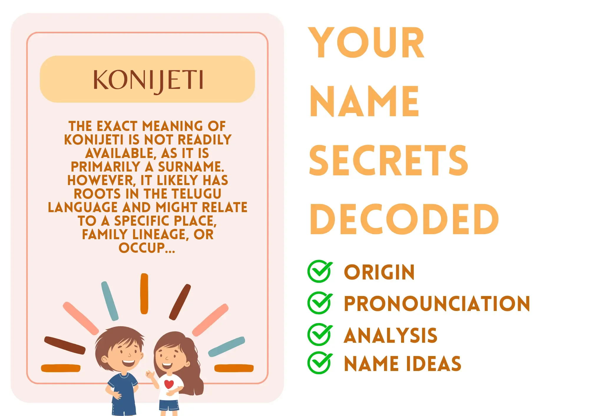 Imagine standing at the edge of a cliff, heart racing, ready to plunge into an adventure. That’s what it feels like to be a Konijeti! With roots in vibrant cultural traditions, your name brims with the energy of heritage, family, and community spirit. Each syllable of your name is like a building block, raising a monument of identity that’s both strong and inspiring. Who wouldn’t want to be the person who brings tales from the past into their future? Your name might be less common, but it carries the weight and beauty of stories waiting to unfold!