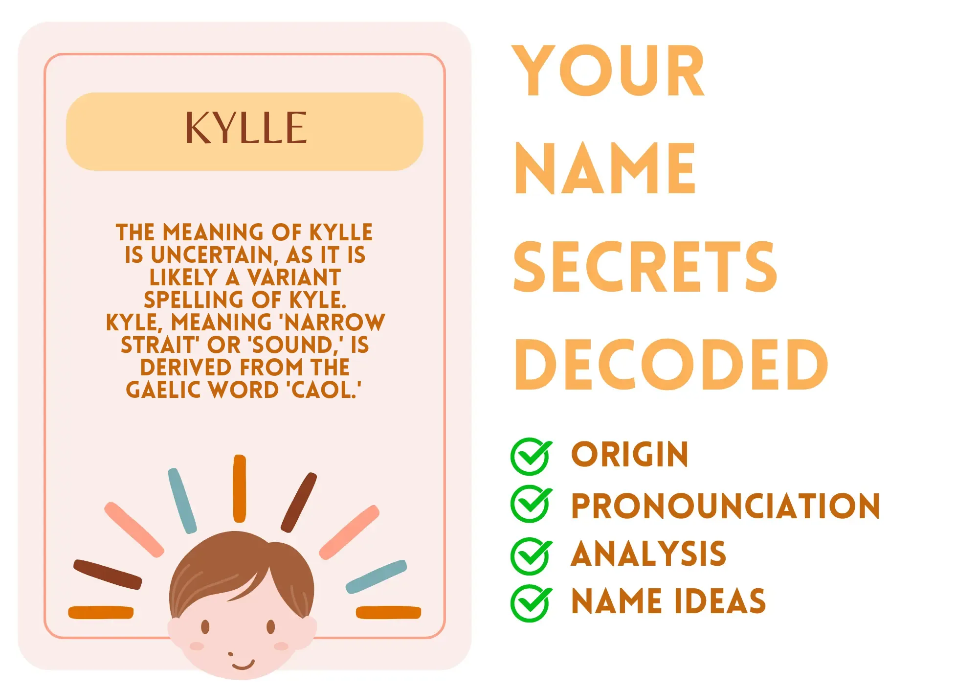 Meaning: The meaning of Kylle is uncertain, as it is likely a variant spelling of Kyle. Kyle, meaning 'narrow strait' or 'sound,' is derived from the Gaelic word 'caol.'