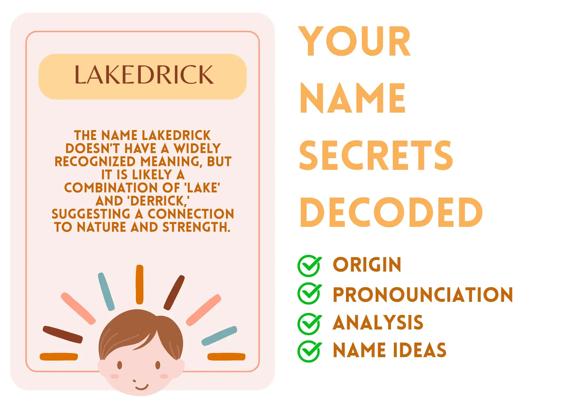 Meaning: The name Lakedrick doesn't have a widely recognized meaning, but it is likely a combination of 'Lake' and 'Derrick,' suggesting a connection to nature and strength.