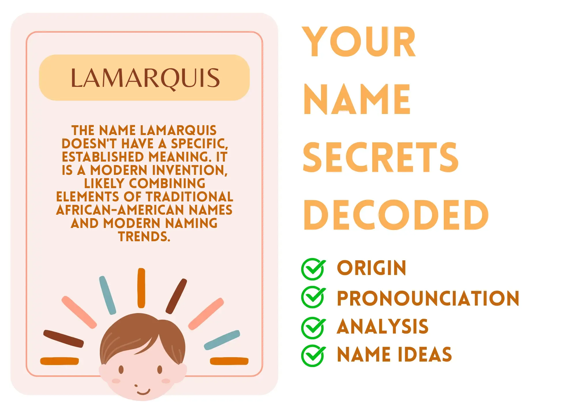 Origin: The name Lamarquis is a modern invention, likely originating in the United States. It is a combination of elements from traditional African-American naming practices and contemporary naming trends.