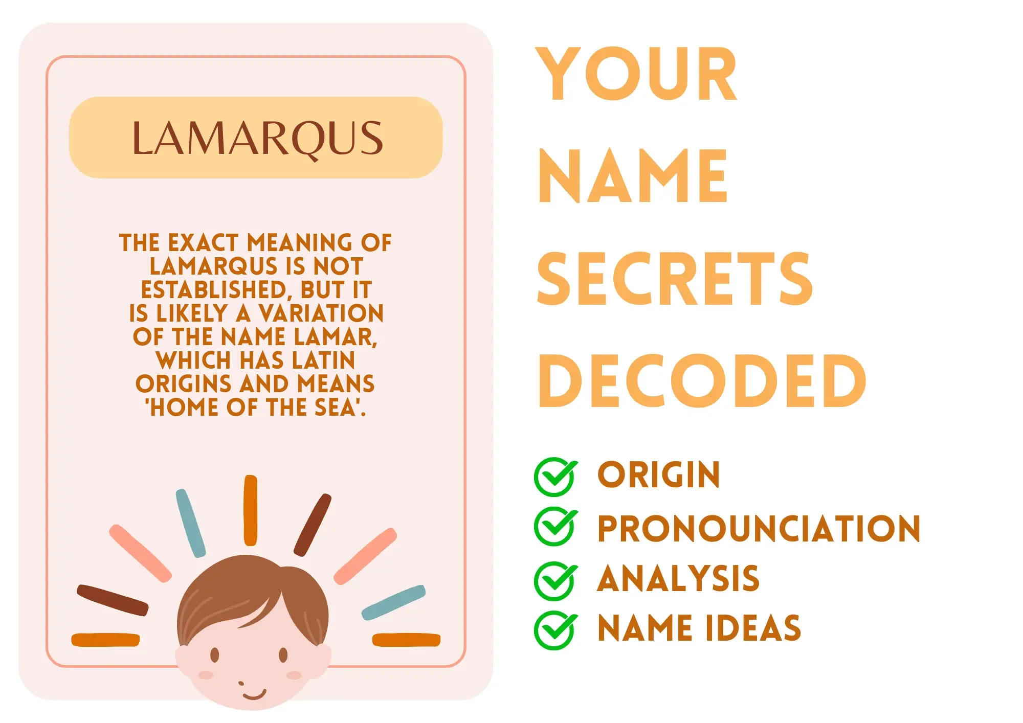 Meaning: The exact meaning of Lamarqus is not established, but it is likely a variation of the name Lamar, which has Latin origins and means 'home of the sea'.