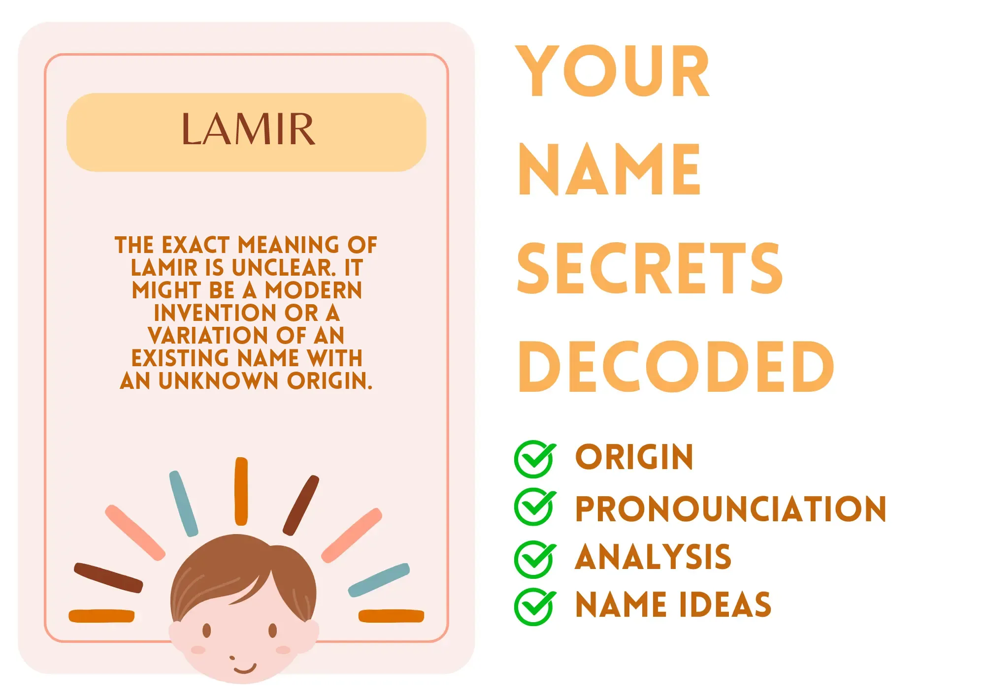 Lamir’s identity is like a locked treasure chest, filled with diverse influences yet to be fully discovered. Just like an uncharted island, you thrive in your uniqueness and have an air of mystery about you. You may find yourself navigating through different social circles effortlessly, as your adaptability helps you connect with others easily. It’s like being a chameleon; you blend in beautifully yet always remain distinct. For you, being Lamir means you embrace who you are, even when the meaning of your name remains a bit of a riddle. This intrigue ignites a natural curiosity in others, pulling them into your orbit.