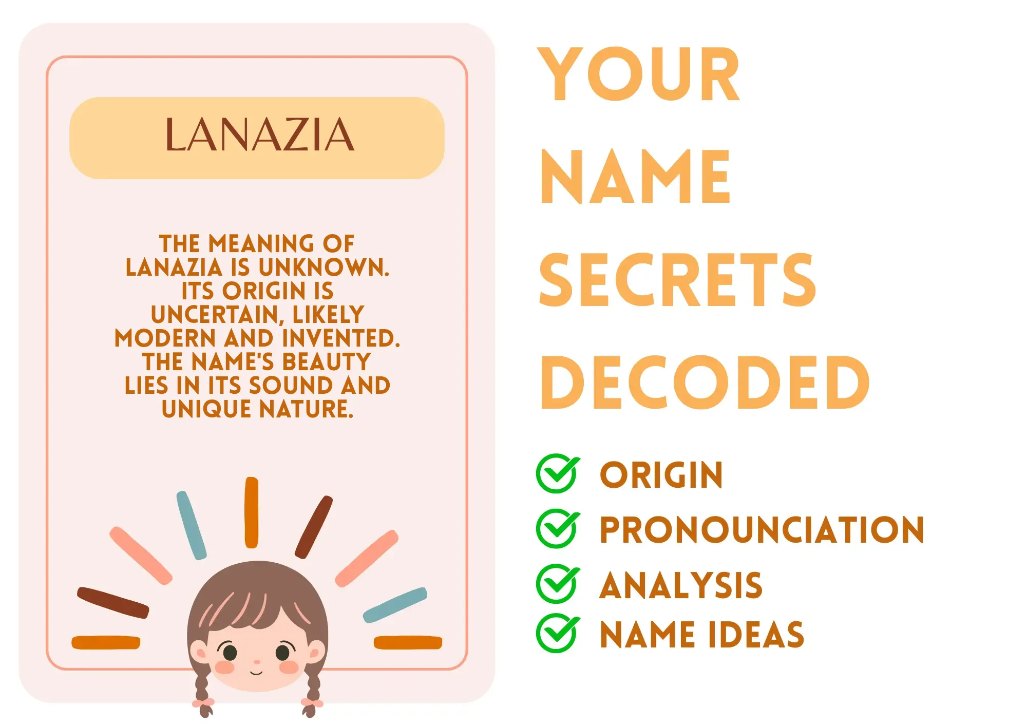 Meaning: The meaning of Lanazia is unknown. Its origin is uncertain, likely modern and invented. The name's beauty lies in its sound and unique nature.