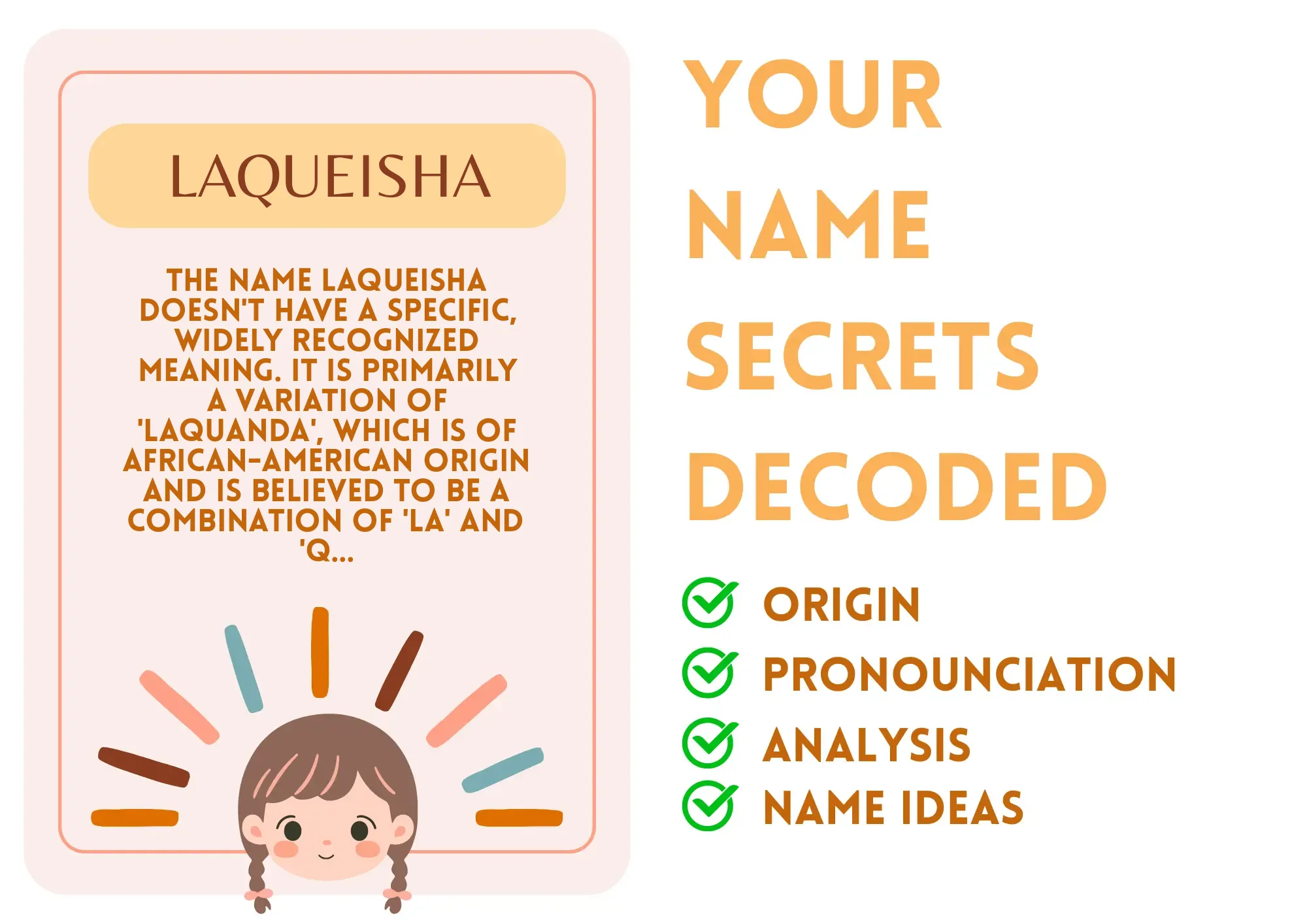 Origin: Laqueisha is of African-American origin, believed to be a variation of the name 'Laquanda'.