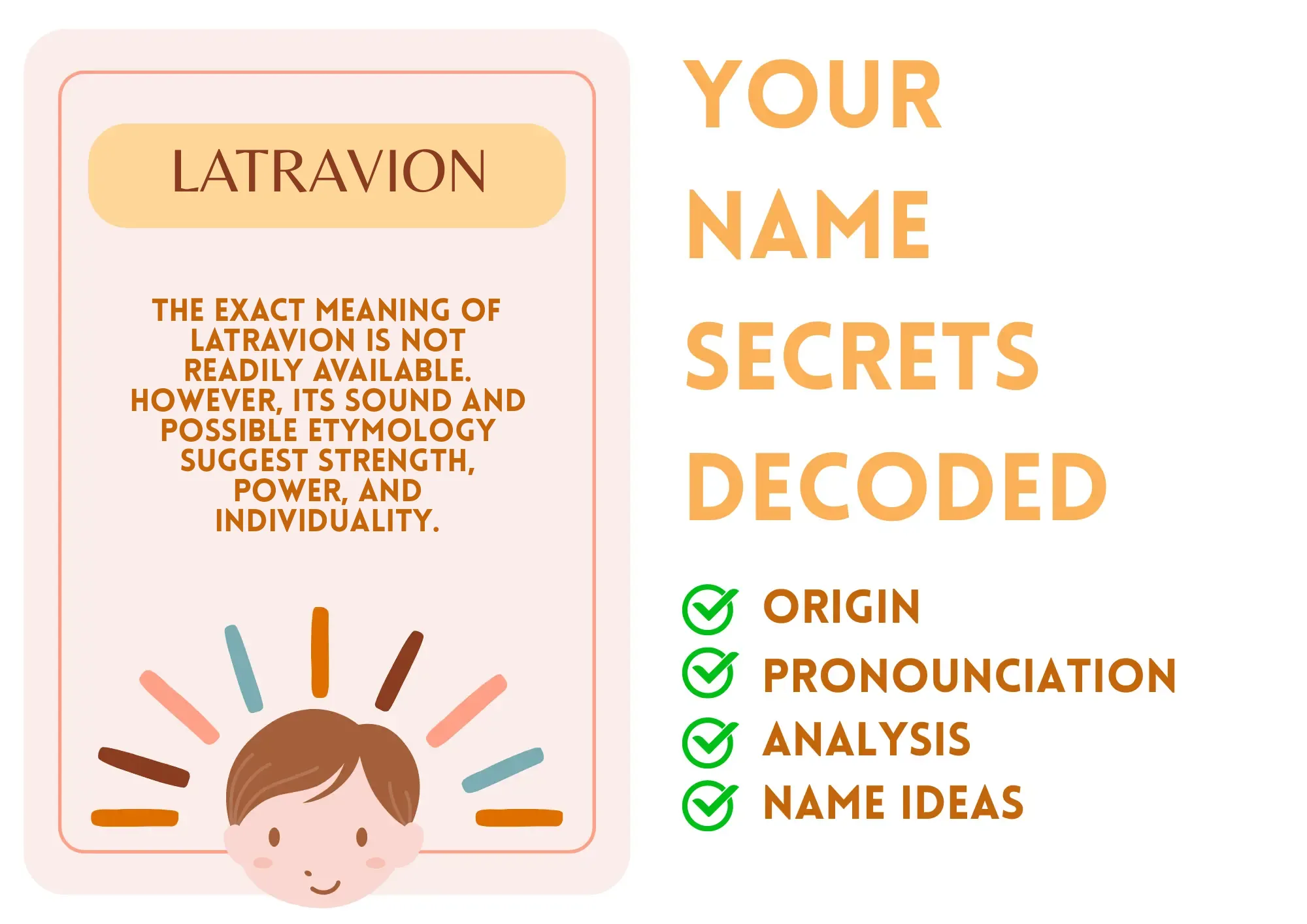 Latravion is a unique and modern name, primarily used for boys. Its origin is likely a combination of Latin and English elements, suggesting a name with a strong and individualistic feel. The meaning of Latravion is not readily available, but its sound evokes a sense of strength, power, and individuality.