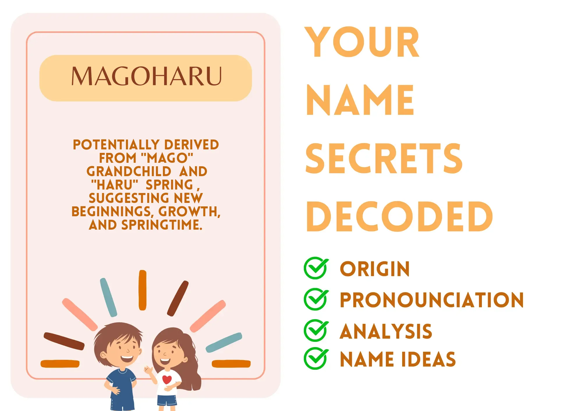 Magoharu is a unique and distinctive name with Japanese origins, potentially derived from the combination of two words: "mago" meaning "grandchild" and "haru" meaning "spring." The name evokes imagery of new beginnings, growth, and the beauty of springtime.