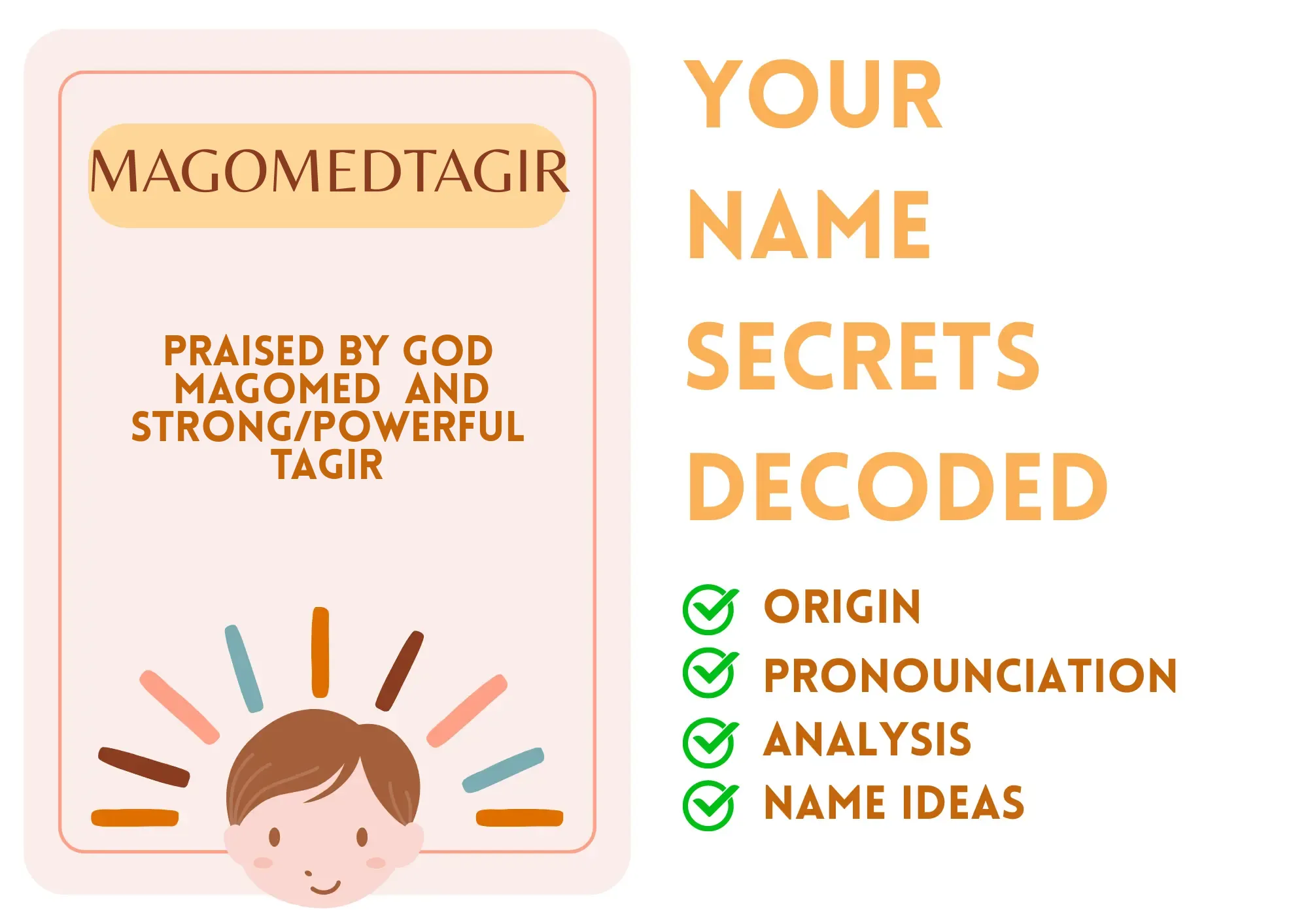 Magomedtagir is a unique and culturally rich name of Chechen origin. It is a combination of two names: Magomed, meaning 'praised by God,' and Tagir, meaning 'strong' or 'powerful.' This name is primarily used for boys and holds significant meaning within Chechen culture and Islam. It signifies strength, faith, and divine blessing.