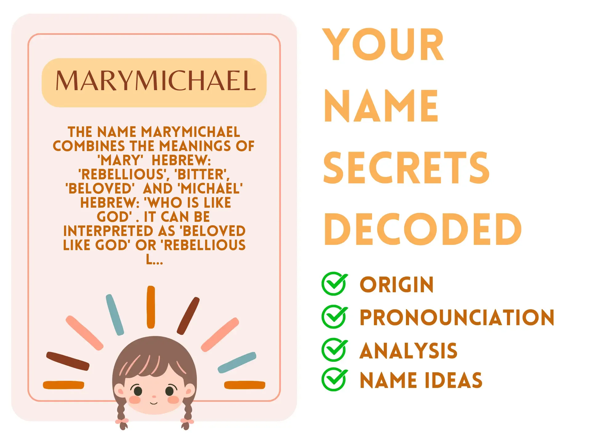 Background: The name Marymichael holds significant religious connotations, particularly within Christianity. 'Mary' is the name of the mother of Jesus, and 'Michael' is a prominent archangel in Christian tradition.