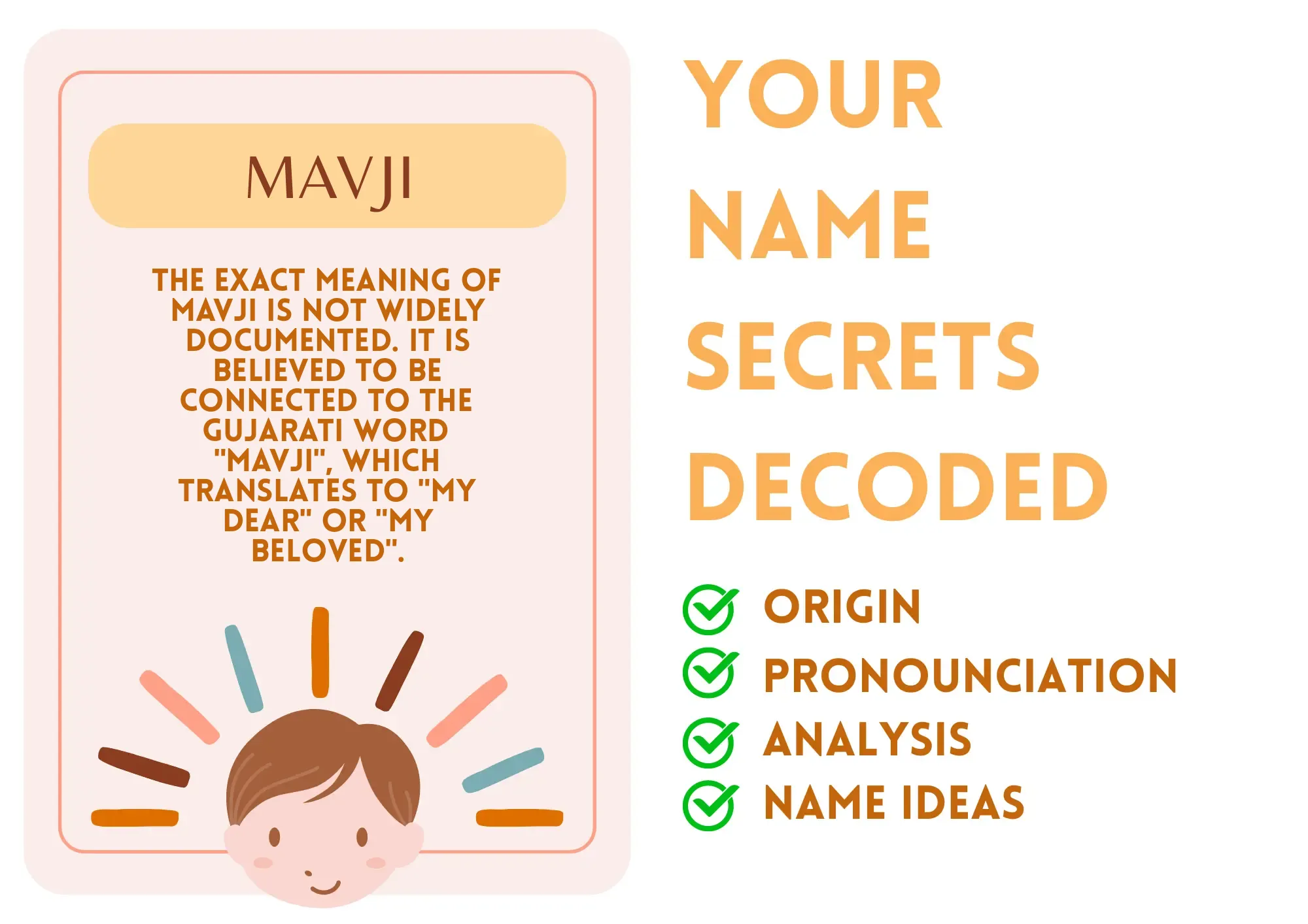 Meaning: The exact meaning of Mavji is not widely documented. It is believed to be connected to the Gujarati word "Mavji", which translates to "my dear" or "my beloved".