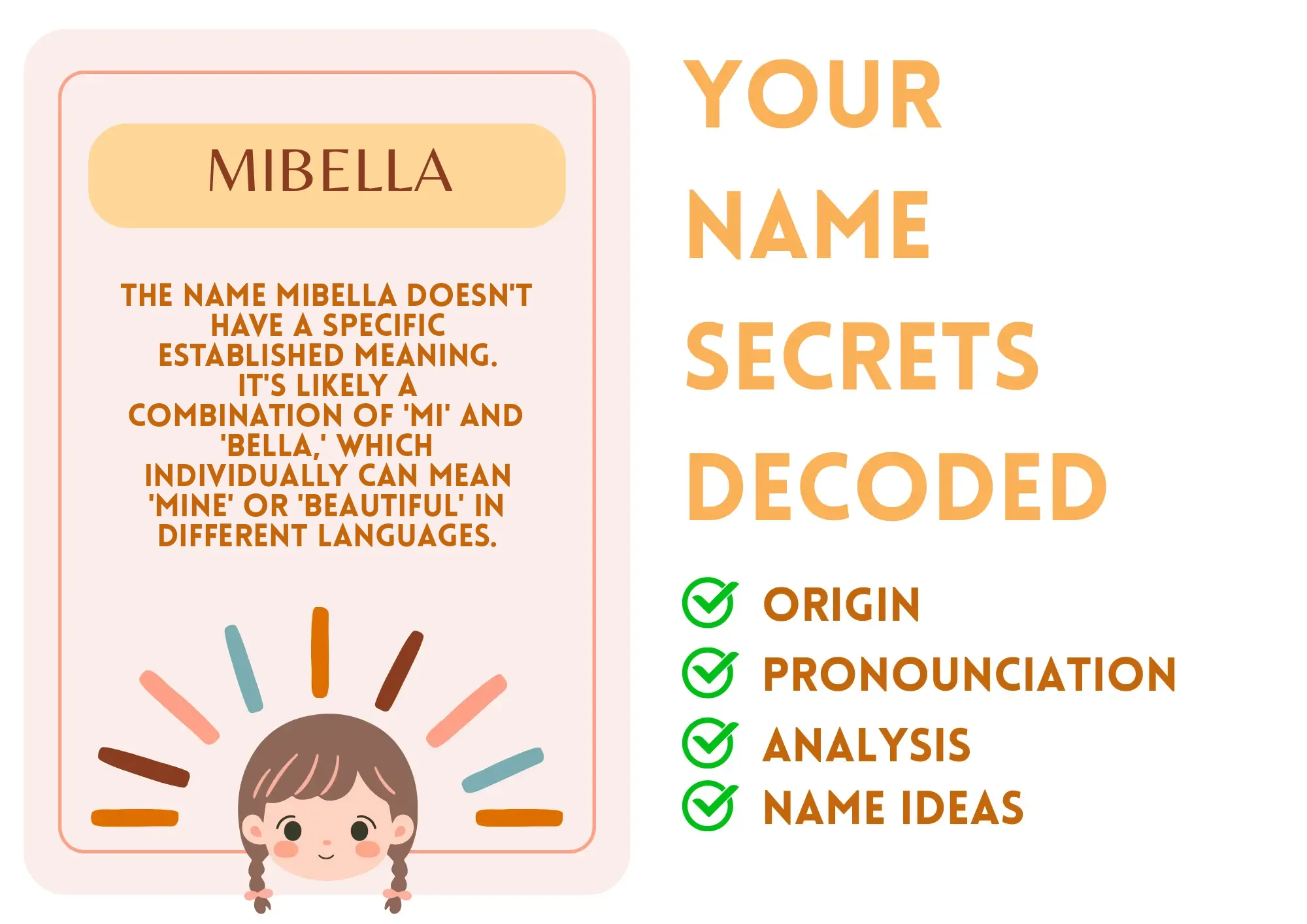 The name Mibella seems to combine “Mi,” which can mean “mine,” and “Bella,” which stands for “beautiful.” This potent mix allows Mibella to embody a sense of ownership over her beauty and uniqueness. It’s like when you find that perfect outfit that just screams you! Mibella understands the importance of self-acceptance and celebrates her individuality. Whether it’s expressing herself through fashion, art, or friendships, she owns her uniqueness and encourages others to do the same. This core belief transforms her everyday interactions, making her a source of positivity to those around her.