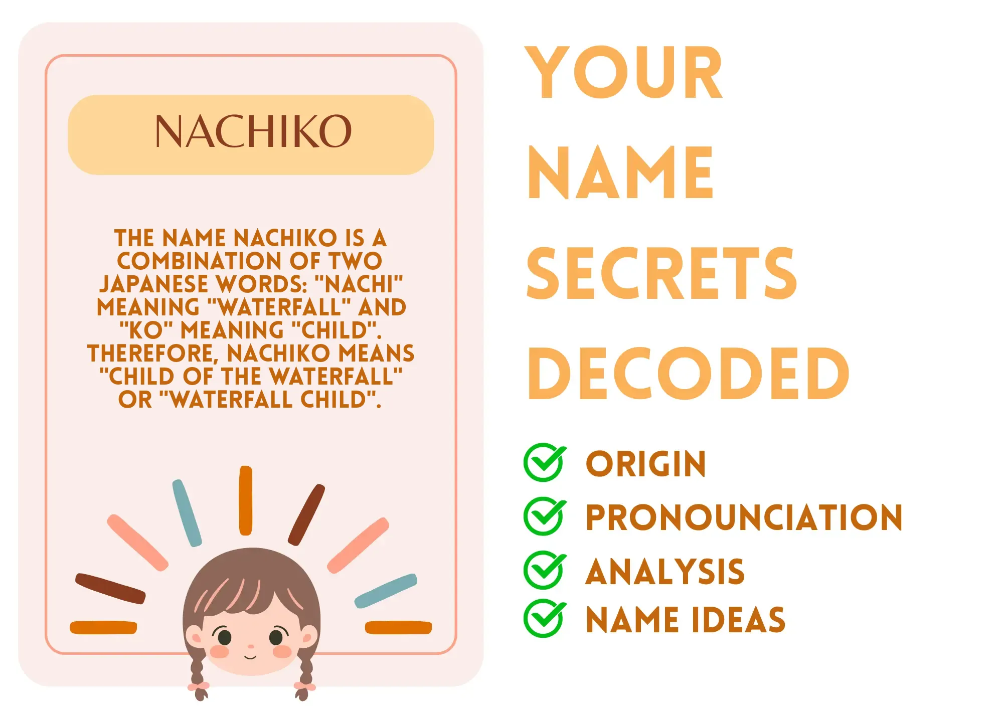 Meaning: The name Nachiko is a combination of two Japanese words: "nachi" meaning "waterfall" and "ko" meaning "child". Therefore, Nachiko means "child of the waterfall" or "waterfall child".