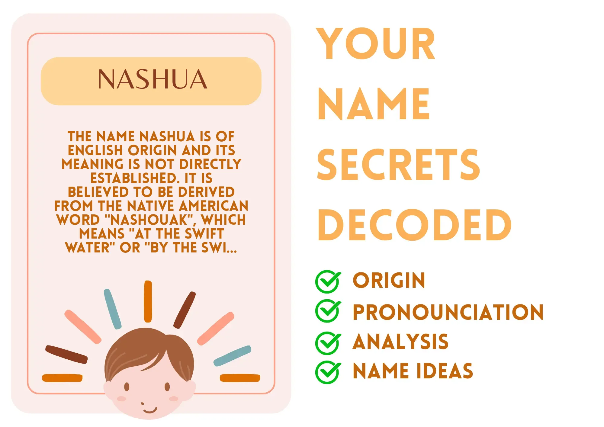 Cultural Significance: The name Nashua is primarily linked to the city of Nashua in New Hampshire, USA, which has a rich industrial history and a diverse community. The name carries a sense of local significance and history.