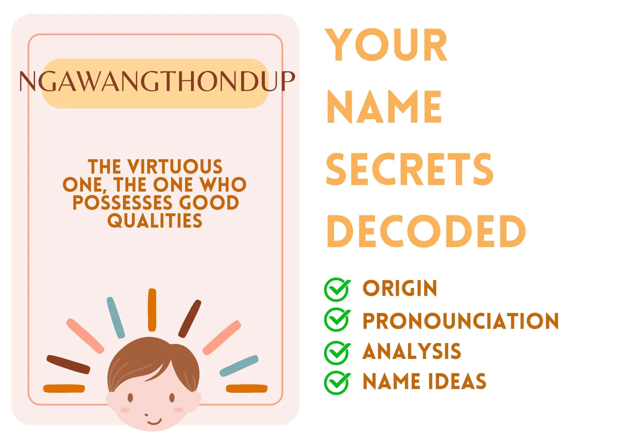 Imagine someone who embodies goodness as naturally as breathing. That’s you, Ngawangthondup! Your name tells a story — a story where virtues shine brighter than gold. It’s a legacy that whispers tales of strength, wisdom, and compassion. While some might stumble over the pronunciation, those who understand the name know it carries a powerful energy that lifts spirits and inspires kindness. You may be the one who, with a smile, shows others that the world isn’t just a place to survive but a canvas to paint goodness and inspiration.