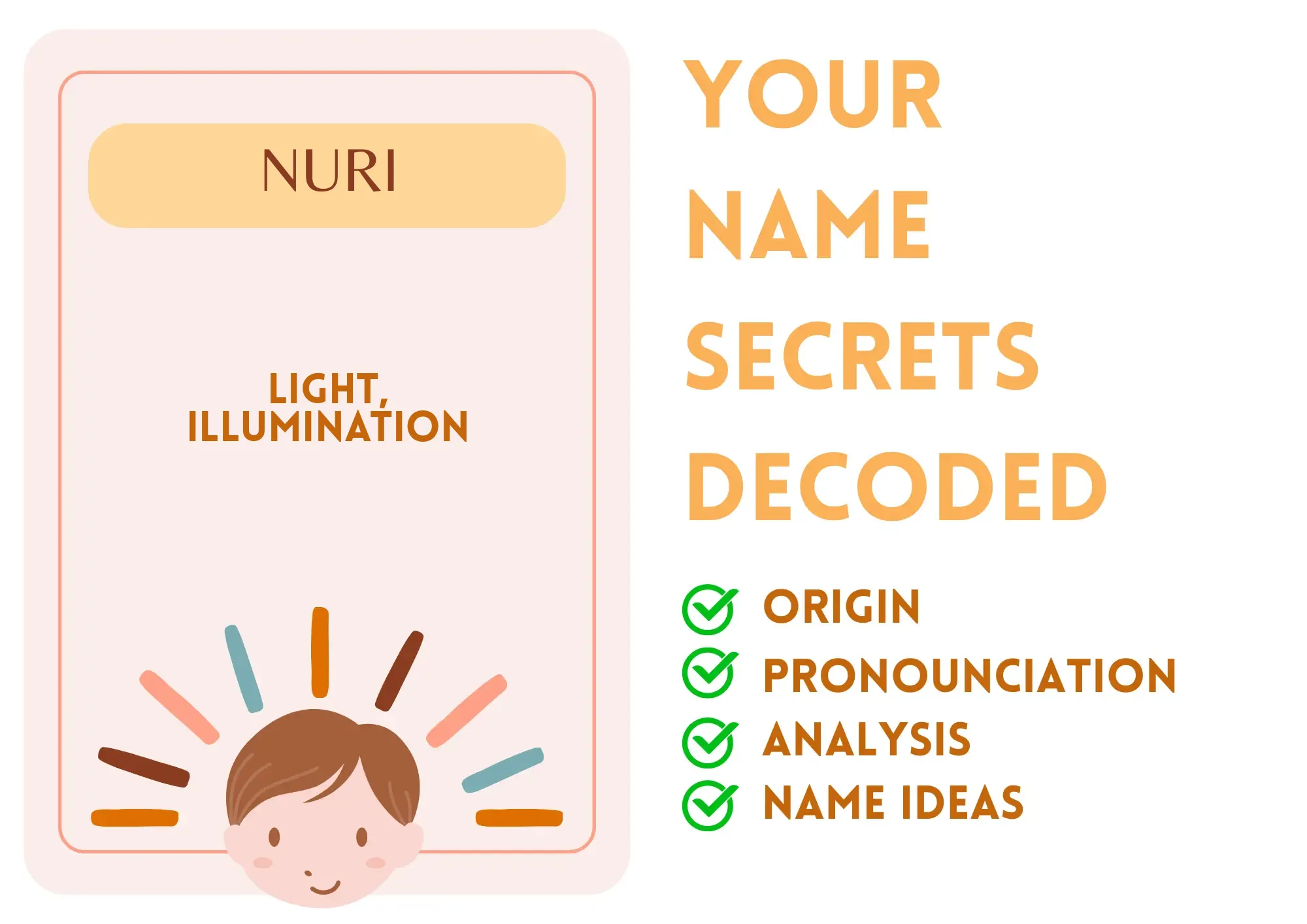 Imagine walking into a room and feeling the warmth of sunlight streaming in— that's the essence of Nuri! It’s a name that carries the powerful vibe of "light" and "illumination." Just like the first rays of dawn that chase away shadows, Nuri is like a breath of fresh air, filled with positivity and energy. When you meet a Nuri, you can’t help but feel a wave of warmth and a gentle push to be your best self. The name has a melodic ring to it, making it not just easy to remember, but also a joy to say!