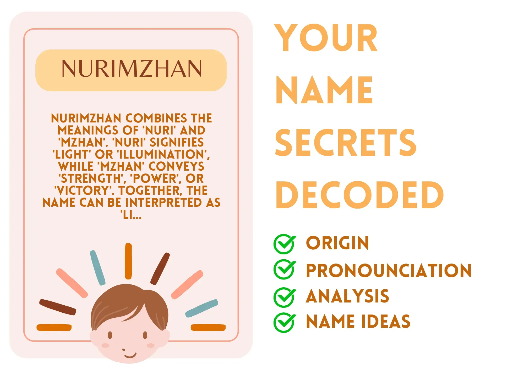 Nurimzhan is a name of Turkic origin, primarily used in Central Asian countries like Kazakhstan and Uzbekistan. It carries a rich meaning and cultural significance, embodying the concepts of light, beauty, and strength. The name is traditionally masculine, although it can be used for girls in some regions.