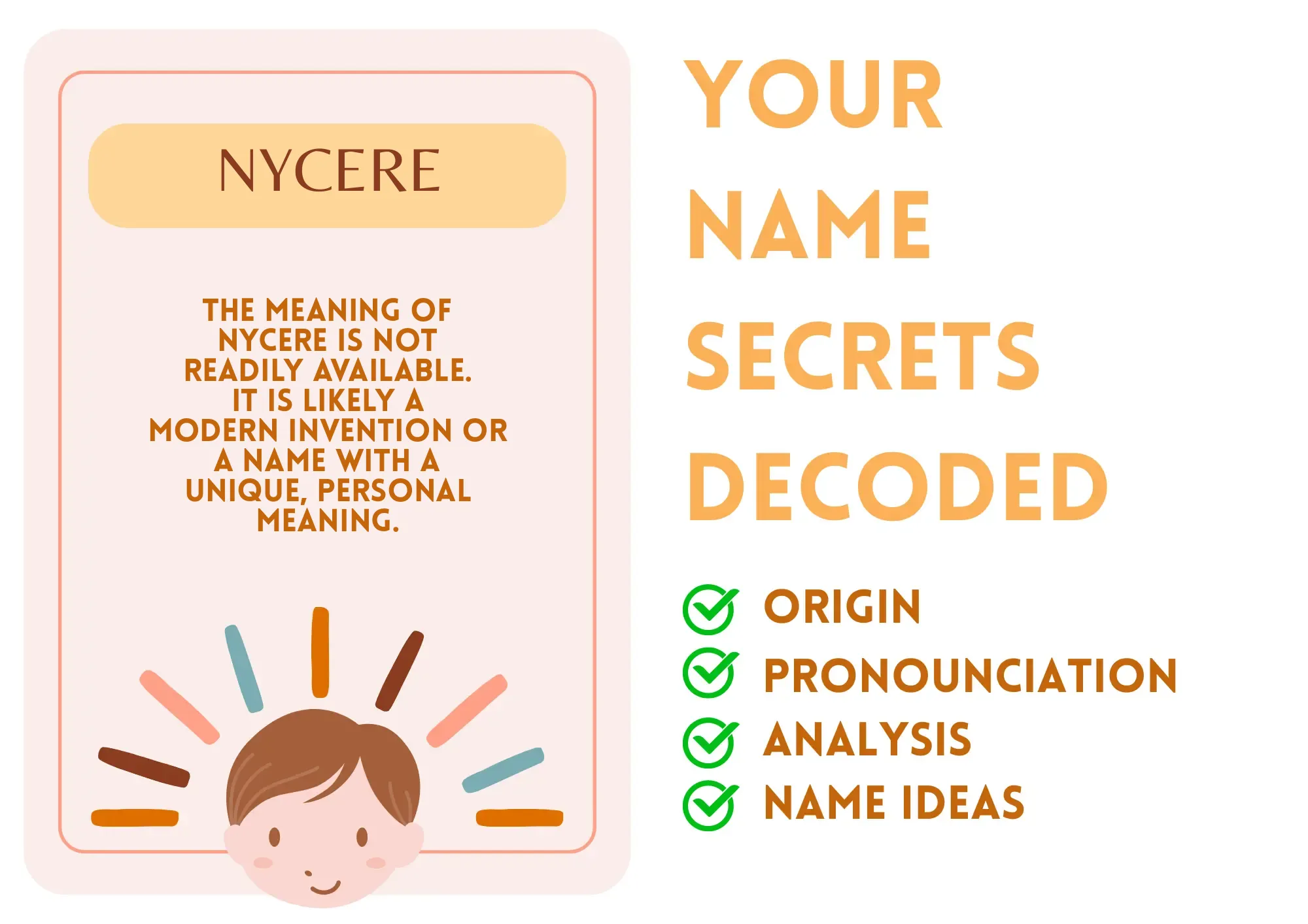 Nycere is a unique and modern name with an intriguing sound. While its origin and meaning are not widely established, it can be interpreted as a blend of sounds that evoke a sense of strength, grace, and individuality. The name's distinctiveness makes it a standout choice for parents seeking a name that is both memorable and unconventional.