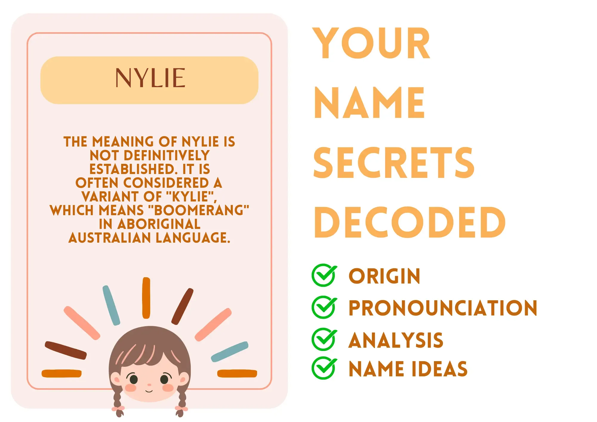 Meaning: The meaning of Nylie is not definitively established. It is often considered a variant of "Kylie", which means "boomerang" in Aboriginal Australian language.