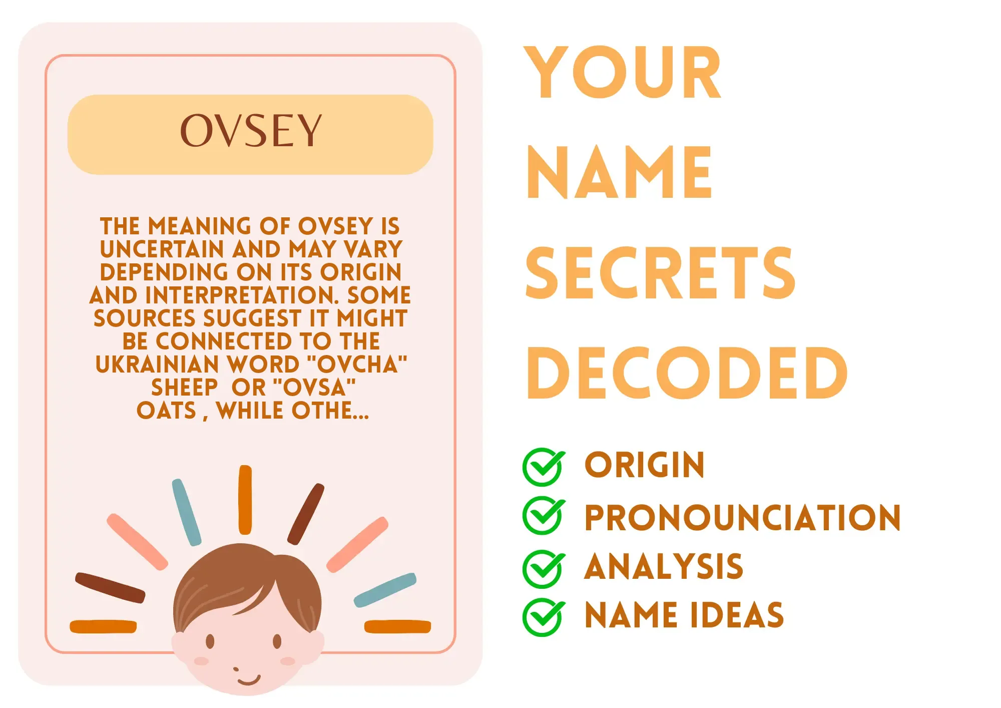 Meaning: The meaning of Ovsey is uncertain and may vary depending on its origin and interpretation. Some sources suggest it might be connected to the Ukrainian word "ovcha" (sheep) or "ovsa" (oats), while others propose it could be a variant of other Ukrainian names with similar sounds.