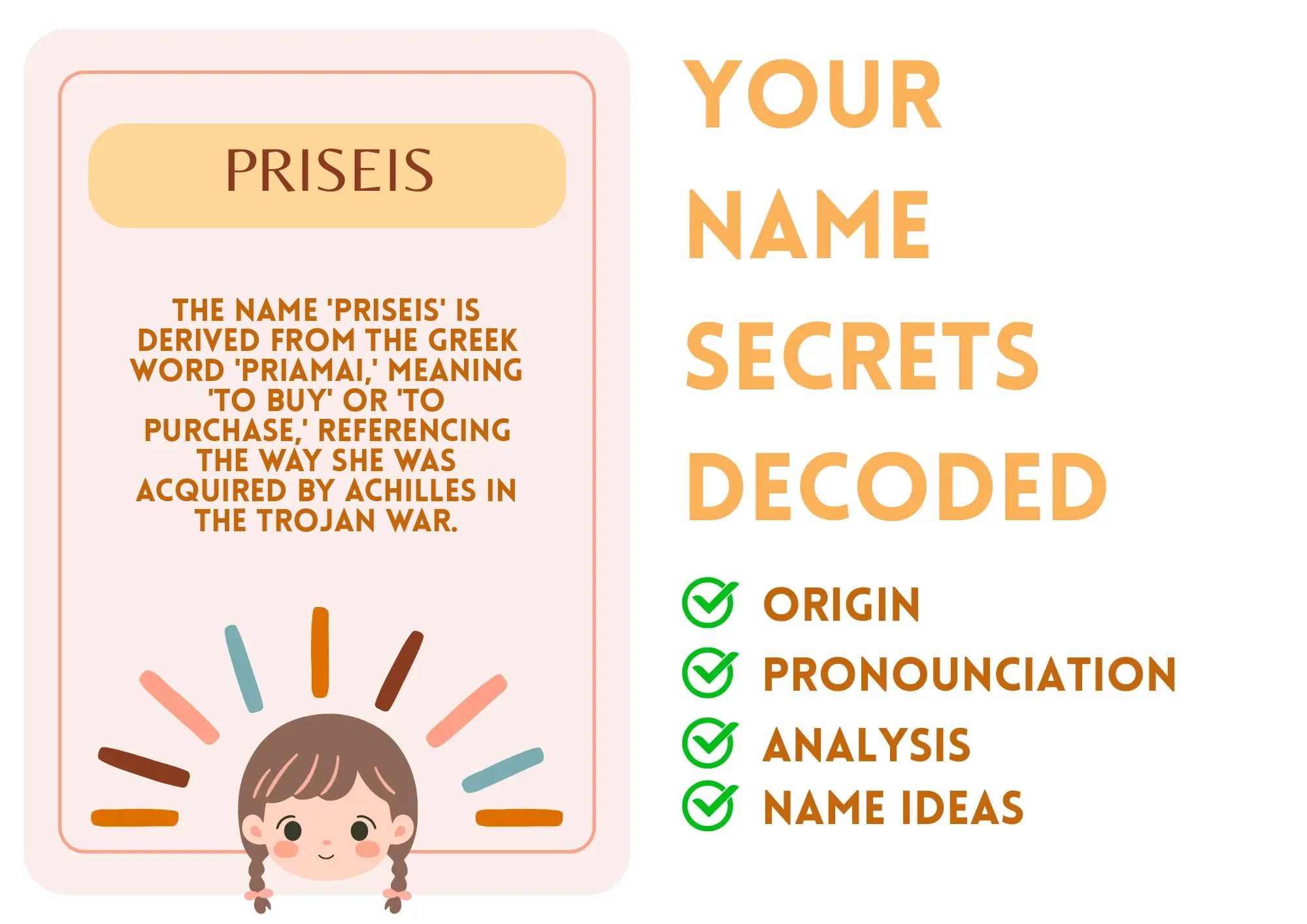 Priseis comes from the Greek word 'priamai,' meaning 'to buy' or 'to purchase.' This connects to her mythological counterpart, acquired by Achilles during the Trojan War. This might feel like the echoes of challenges in your life, like an ongoing quest. Just like Achilles saw something valuable in Priseis, you’re destined to discover the greatness within you. Imagine finding a lost treasure – it’s all about seeing your unique qualities as assets that can be developed and appreciated by others!