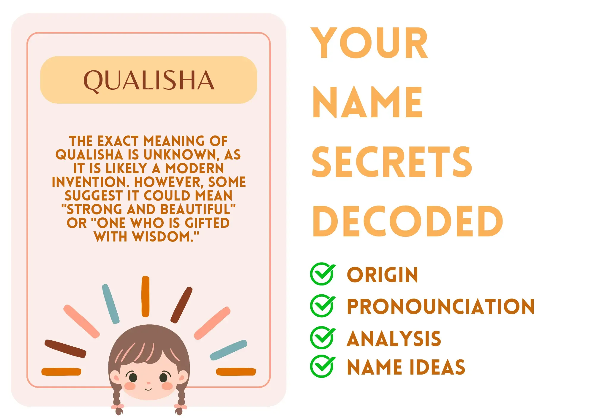 Meaning: The exact meaning of Qualisha is unknown, as it is likely a modern invention. However, some suggest it could mean "strong and beautiful" or "one who is gifted with wisdom."