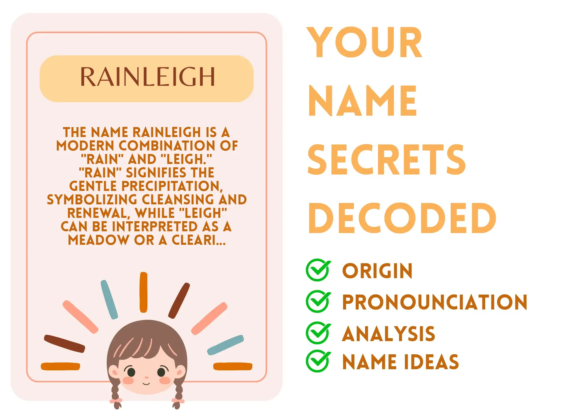 Rainleigh is a unique and enchanting name with a nature-inspired feel. It combines the elements of "rain" and "leigh," which could be interpreted as a meadow or a clearing. The name evokes imagery of gentle showers and lush landscapes, conveying a sense of tranquility and beauty.