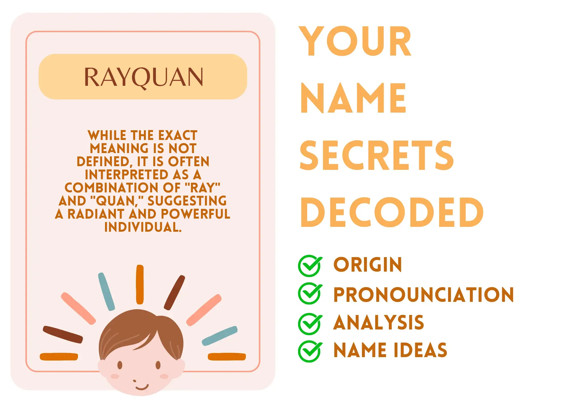 Rayquan is a modern name with African American origins, often associated with strength, power, and individuality. It is primarily a masculine name, carrying a distinct and powerful sound. While its meaning is not explicitly defined, it is often interpreted as a combination of "ray" and "quan," suggesting a radiant and powerful individual.