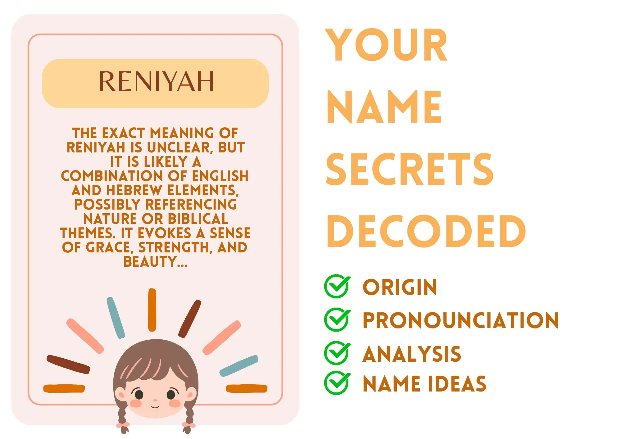 Reniyah is a name that sings like a gentle breeze, presenting a unique blend of charm and originality. If you're looking to make your mark in the world boldly and artistically, Reniyah is the perfect guide to finding your inner rhythm. It’s more than just a name; it’s a unique melody that dances through life, encouraging you to embrace your grace and strength with every beat. Imagine yourself as a vibrant flower, standing tall, bright, and beautiful in a garden filled with unique blooms. That’s Reniyah—a name that brings individuality and beauty to the forefront of your life.