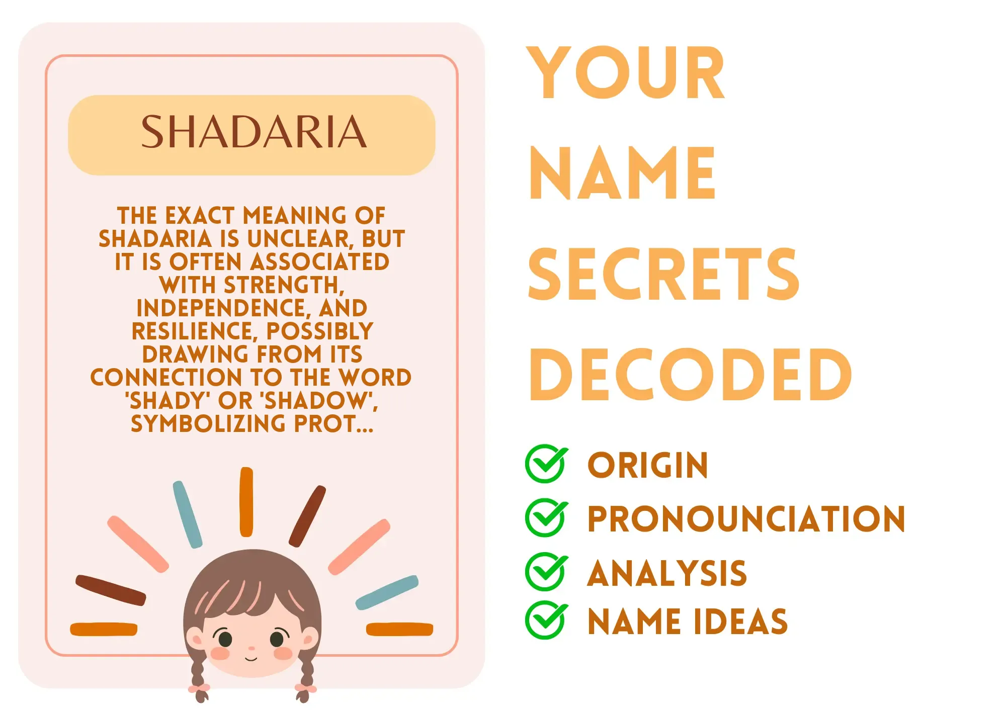 Meaning: The exact meaning of Shadaria is unclear, but it is often associated with strength, independence, and resilience, possibly drawing from its connection to the word 'shady' or 'shadow', symbolizing protection and fortitude.