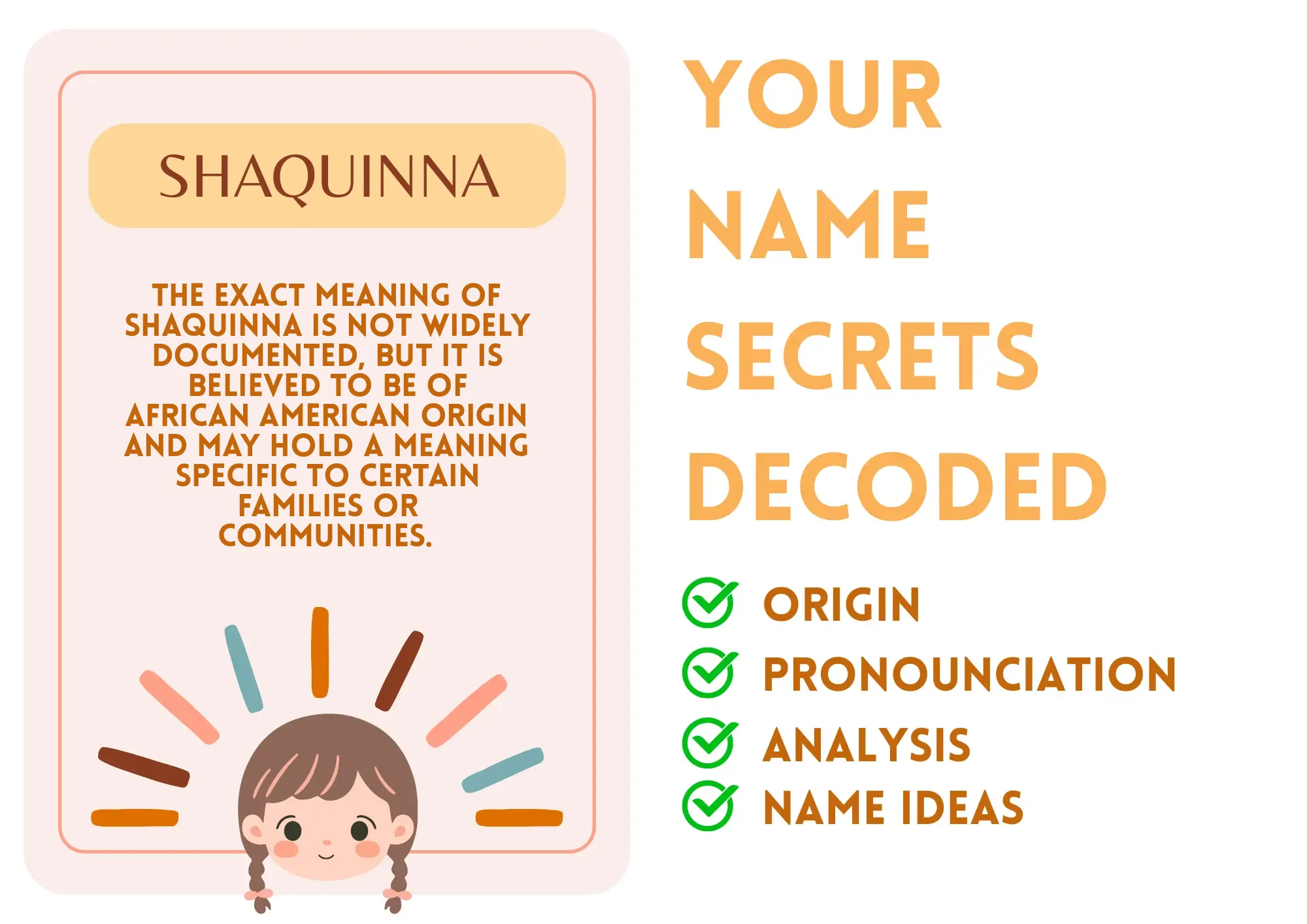 Meaning: The exact meaning of Shaquinna is not widely documented, but it is believed to be of African American origin and may hold a meaning specific to certain families or communities.