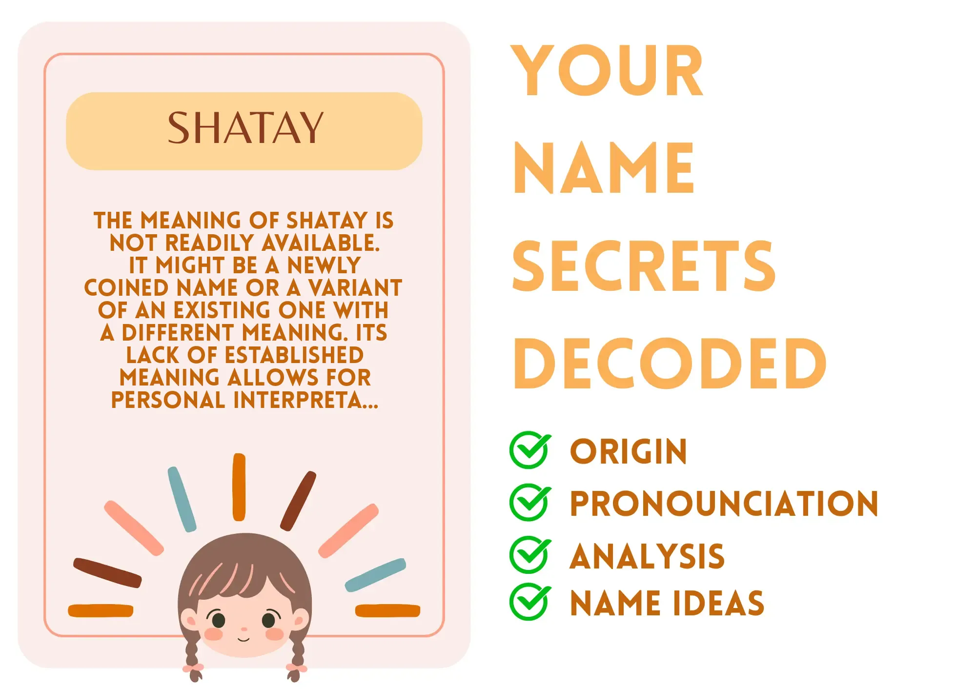 Imagine a name that's like a bookmark in a favorite book—catchy, unique, and easy to remember! That's Shatay for you. With its vibrant sound and modern flair, it represents a canvas where you can paint your own stories. It’s a name that invites you to step into your individuality, and who doesn't want that? Shatay is not just a name; it's a beacon for creativity, community, and a sprinkle of mystery that keeps everyone guessing what comes next.