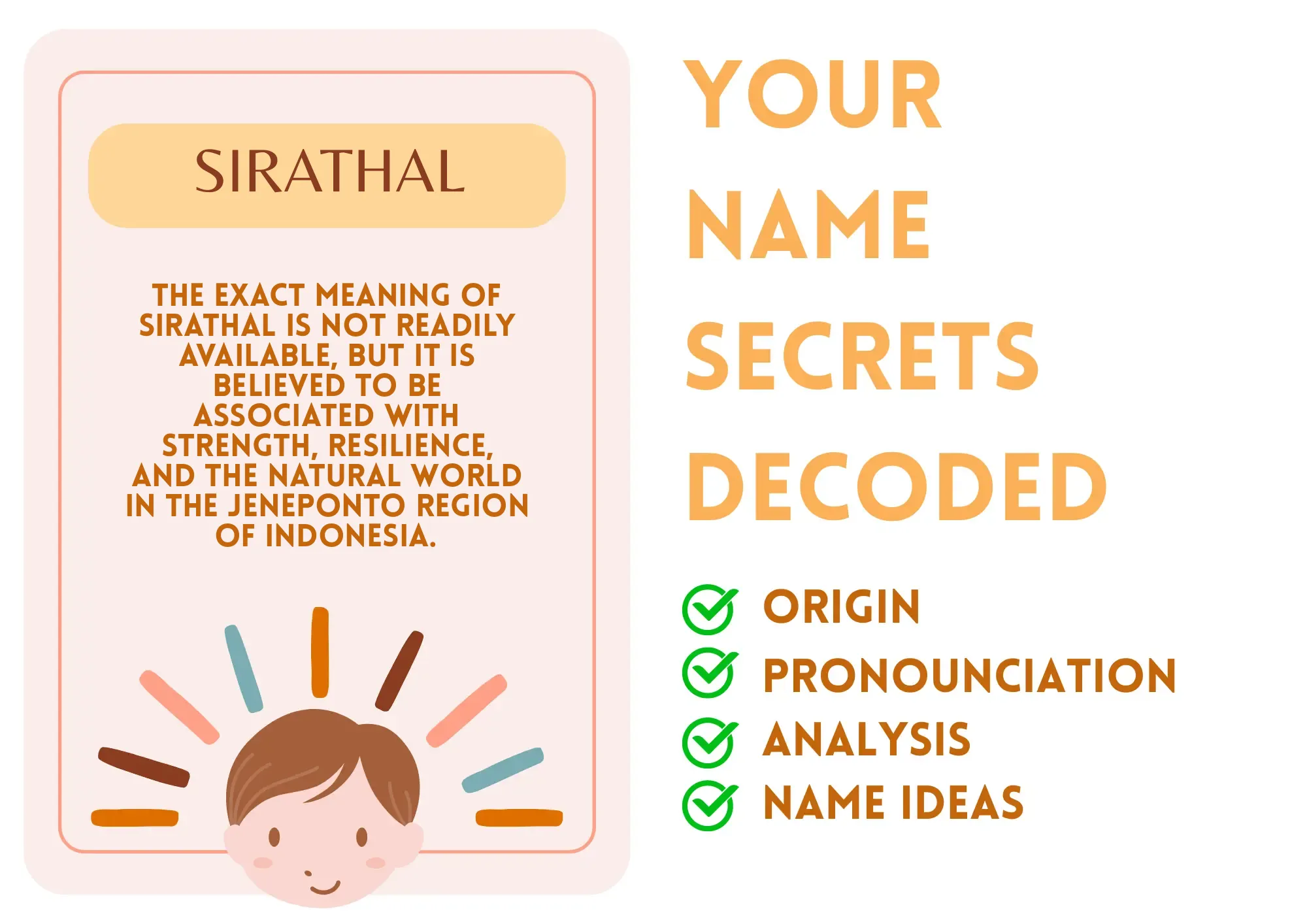 Sirathal is a unique and intriguing name with roots in the Jeneponto region of Indonesia. While the exact meaning remains elusive, it is believed to be associated with strength, resilience, and the natural world. The name is uncommon outside of its region of origin, but its distinct sound and potential for meaning make it a compelling choice for parents seeking a name with a unique and culturally rich background.