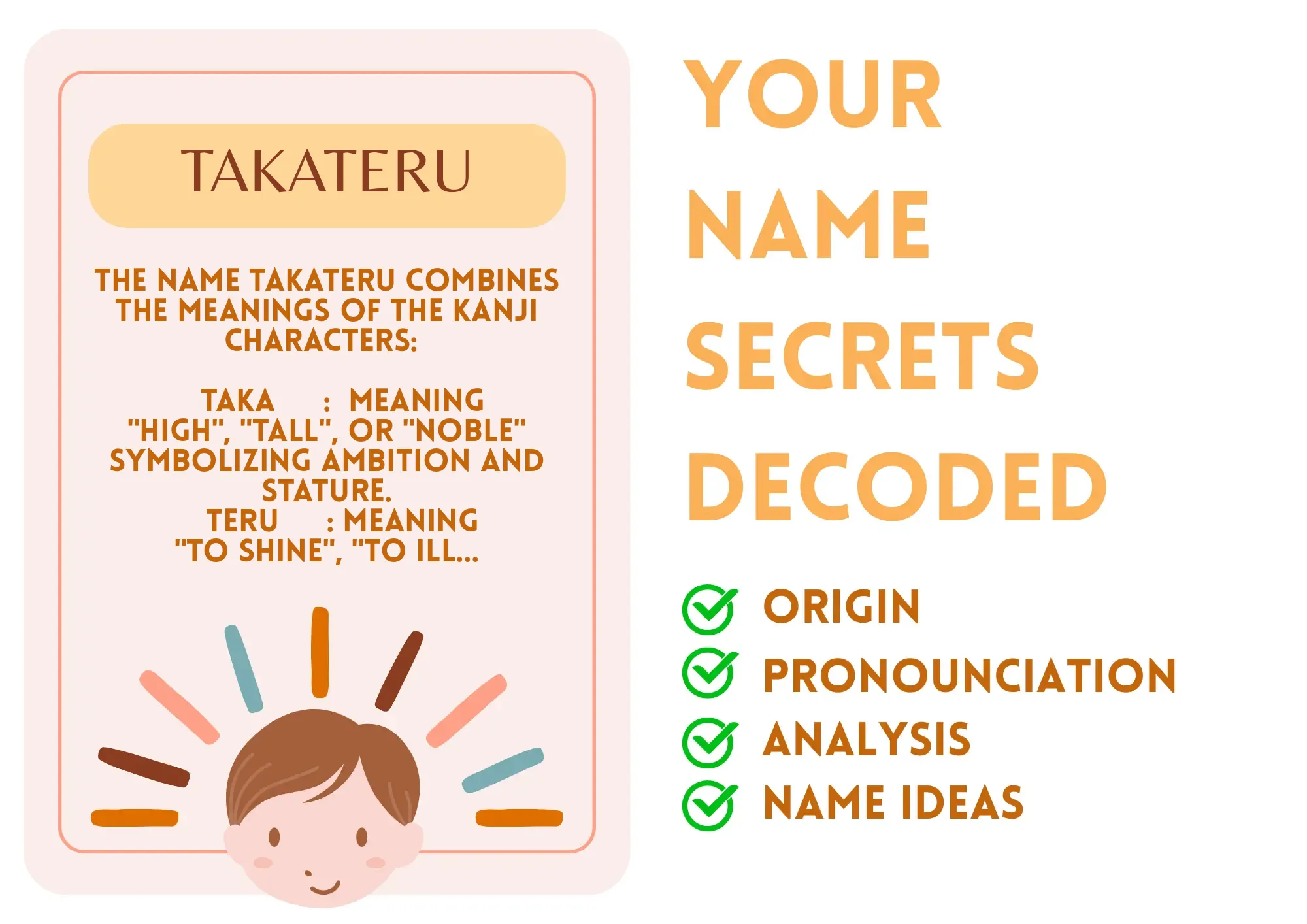 Meaning: The name Takateru combines the meanings of the kanji characters: * **Taka** (高): meaning "high", "tall", or "noble" symbolizing ambition and stature. * **Teru** (輝): meaning "to shine", "to illuminate", or "to be brilliant" symbolizing strength, brilliance, and leadership.