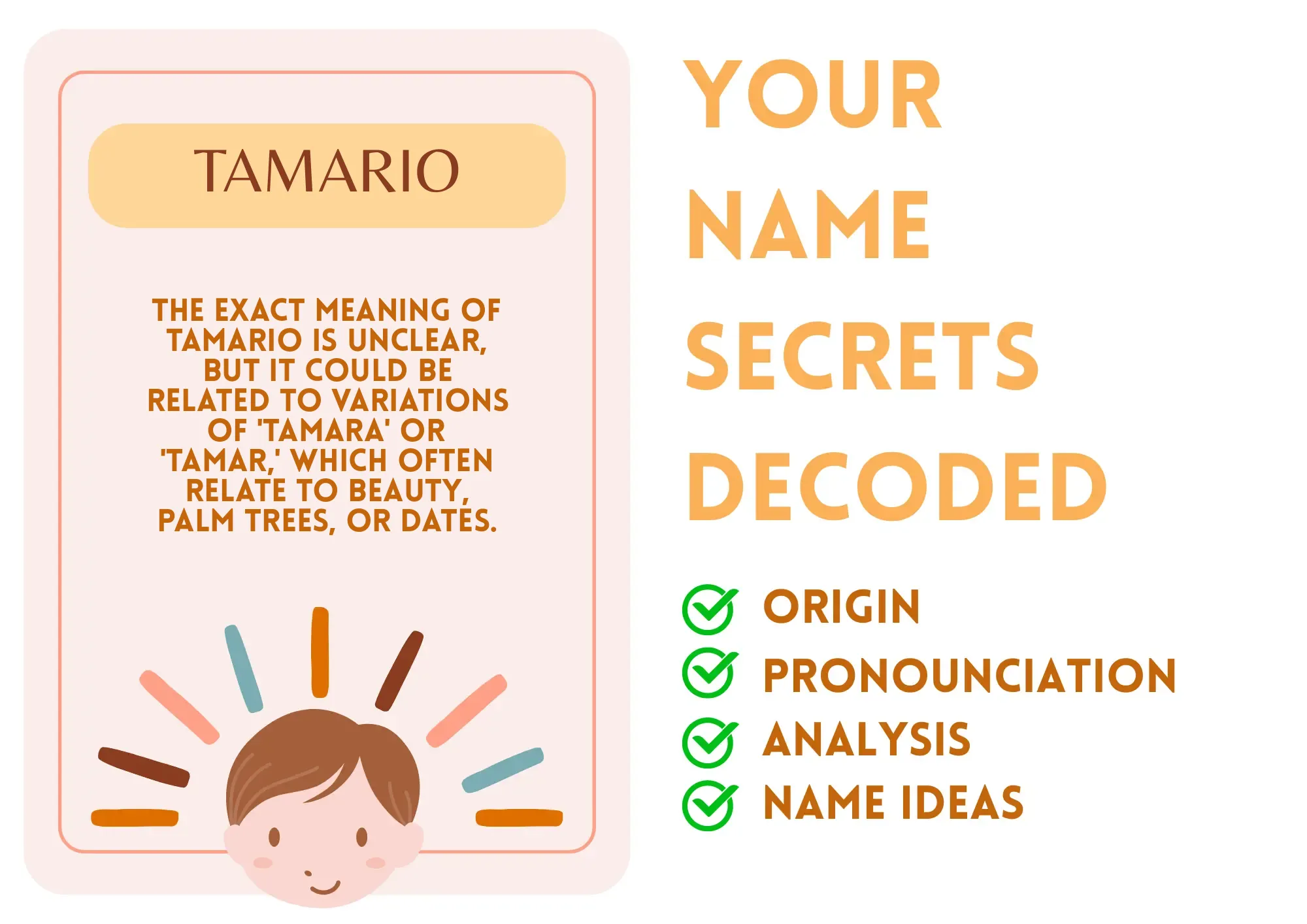 Tamario is a name with a unique and melodic sound, potentially of Spanish or Italian origin. While its exact meaning is unclear, it could be linked to variations of the name 'Tamara' or 'Tamar,' which often have connotations of beauty, palm trees, or dates.