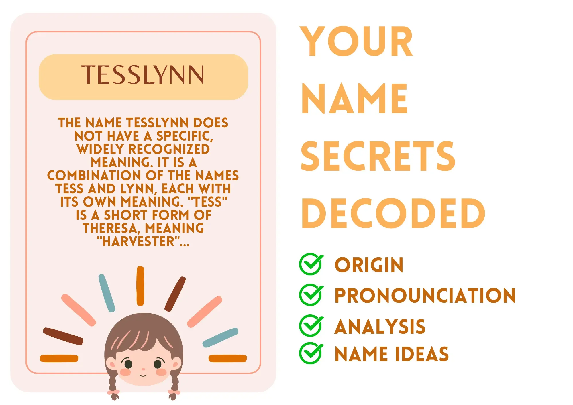 Meaning: The name Tesslynn does not have a specific, widely recognized meaning. It is a combination of the names Tess and Lynn, each with its own meaning. "Tess" is a short form of Theresa, meaning "harvester" or "reaper." "Lynn" is of Celtic origin and can mean "lake" or "waterfall."