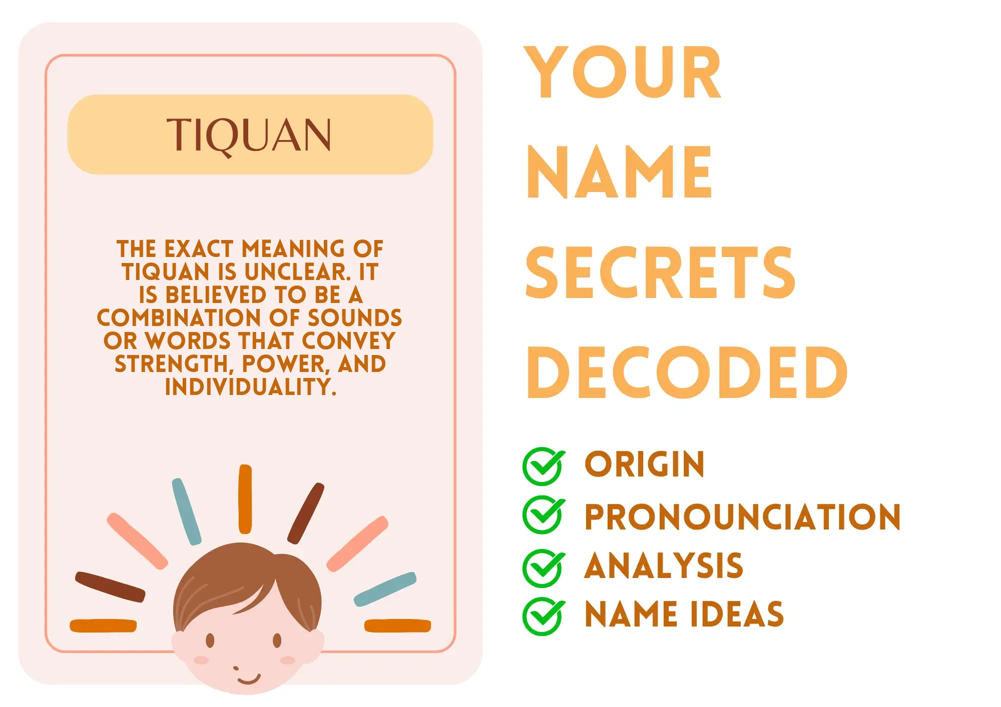 Tiquan is a unique and modern name with a strong, masculine feel. It is primarily used in African American communities and is gaining popularity as a distinctive and memorable choice. While the origin and exact meaning are unclear, it is often associated with strength, power, and individuality.