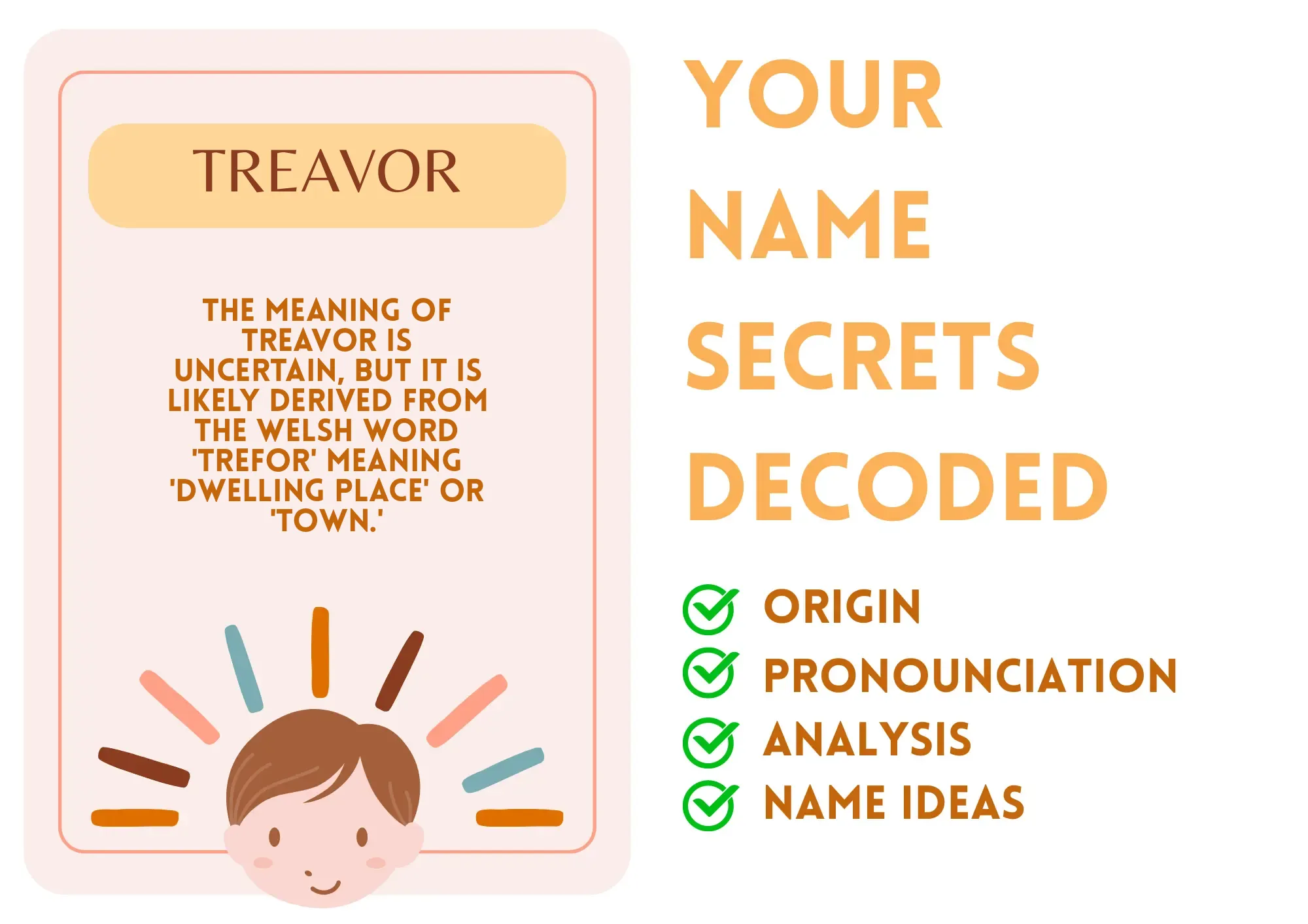 Treavor is a unique and masculine name with a strong and rugged feel. Its origin is uncertain, but it is likely a variant of Trevor, which itself has English and Welsh roots. Treavor is a relatively uncommon name, but it carries a sense of individuality and strength.