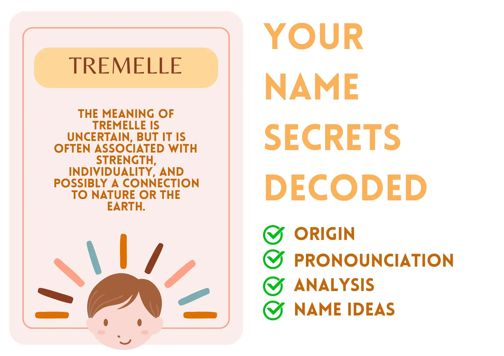Think of a name that rolls off the tongue like a melody, vibrant yet solid. That’s Tremelle! Picture standing in a crowd, and somehow—boom!—everyone’s head turns because they heard your name. Tremelle is that name—unique, captivating, and a hint of mystery hanging in the air. It evokes a sense of strength that can help you tackle anything life throws your way. It doesn’t just mean individuality; it wears it like a badge! When you walk into a room, you don’t just blend in; you stand out like a sunset against a gray day.