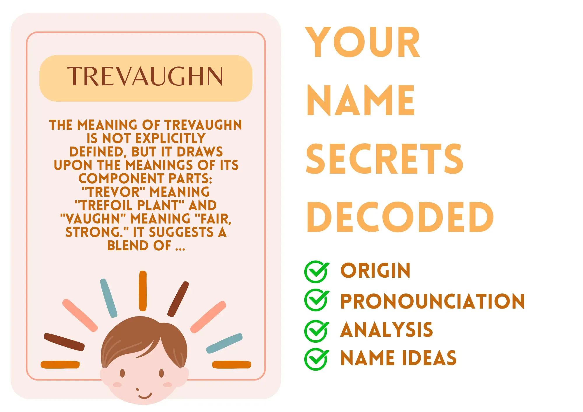 Meaning: The meaning of Trevaughn is not explicitly defined, but it draws upon the meanings of its component parts: "Trevor" meaning "trefoil plant" and "Vaughn" meaning "fair, strong." It suggests a blend of traditional and modern values.