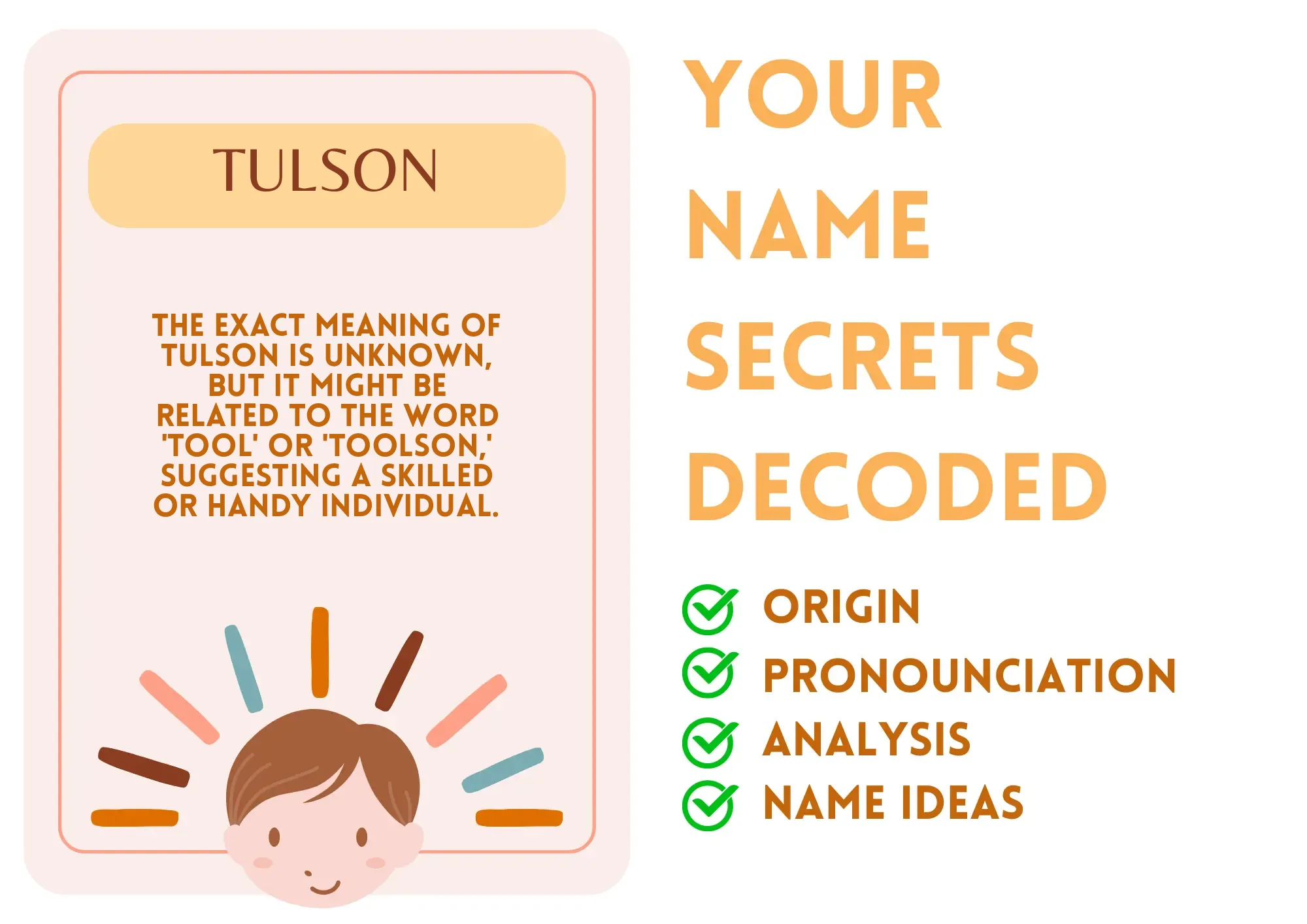 Meaning: The exact meaning of Tulson is unknown, but it might be related to the word 'tool' or 'toolson,' suggesting a skilled or handy individual.