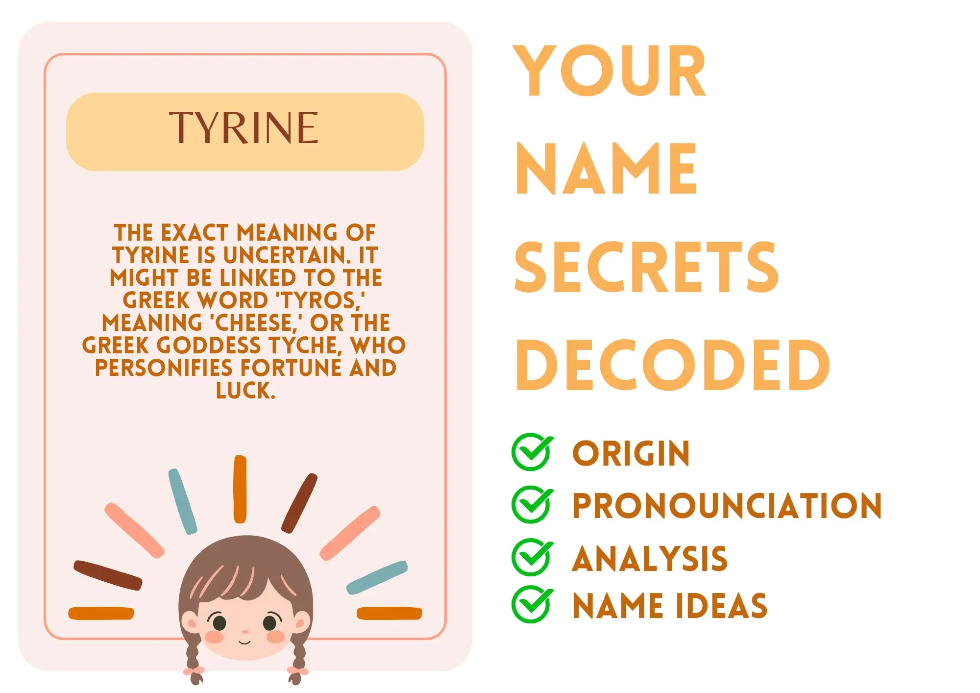 Tyrine resonates with the idea of luck and fortune, linked to the Greek goddess of good fortune. Just picture someone who strides into a room, lighting it up with their infectious energy, like a burst of sunshine on a gloomy day! Tyrine embodies a spirit that thrives on optimism. Whether meeting new friends or diving headfirst into new adventures, Tyrine is a beacon of positivity, motivating others to see the silver lining in every cloud. It’s as if their name acts like a lucky charm, granting them a sprinkle of magic wherever they go.