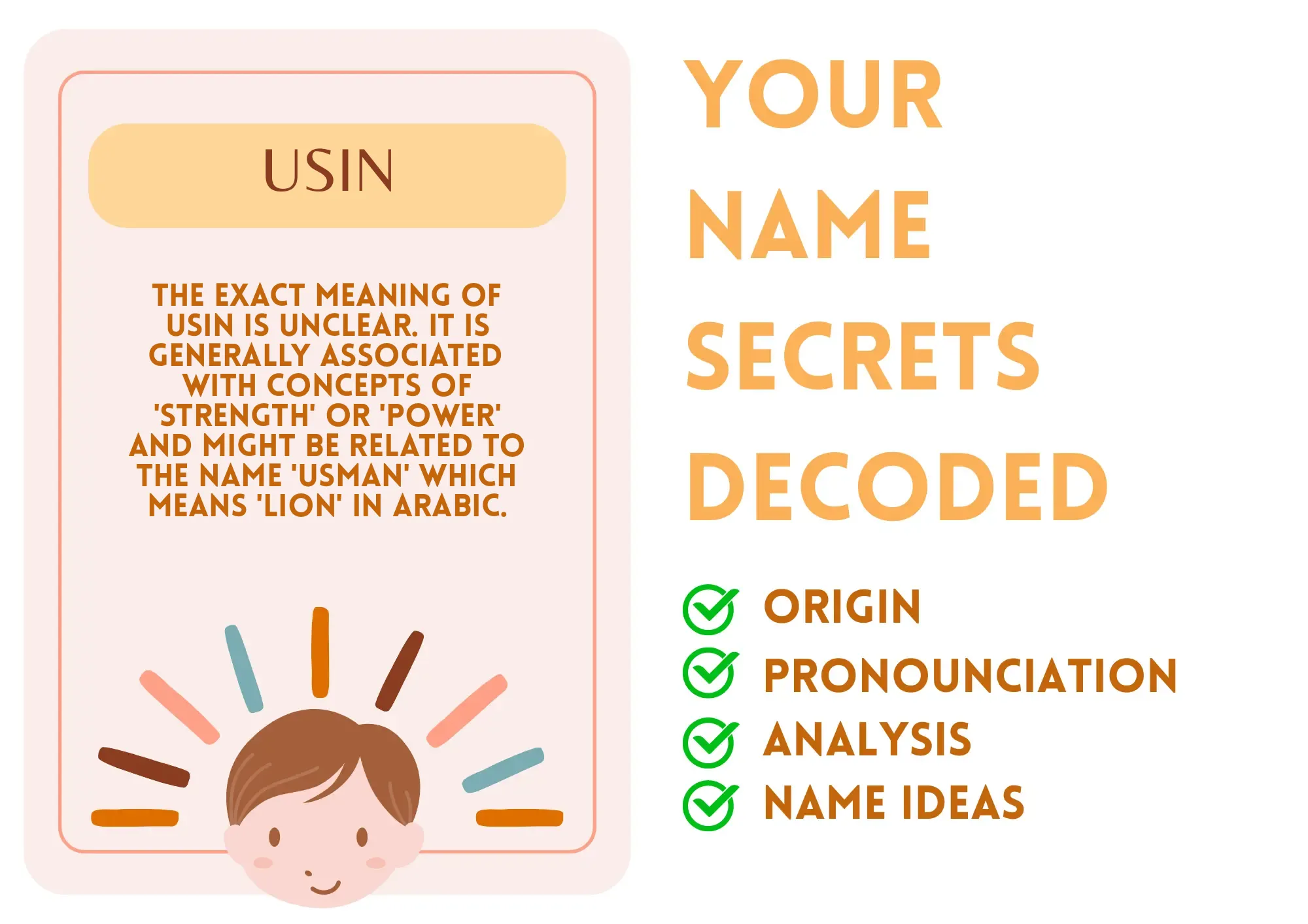 Meaning: The exact meaning of Usin is unclear. It is generally associated with concepts of 'strength' or 'power' and might be related to the name 'Usman' which means 'lion' in Arabic.