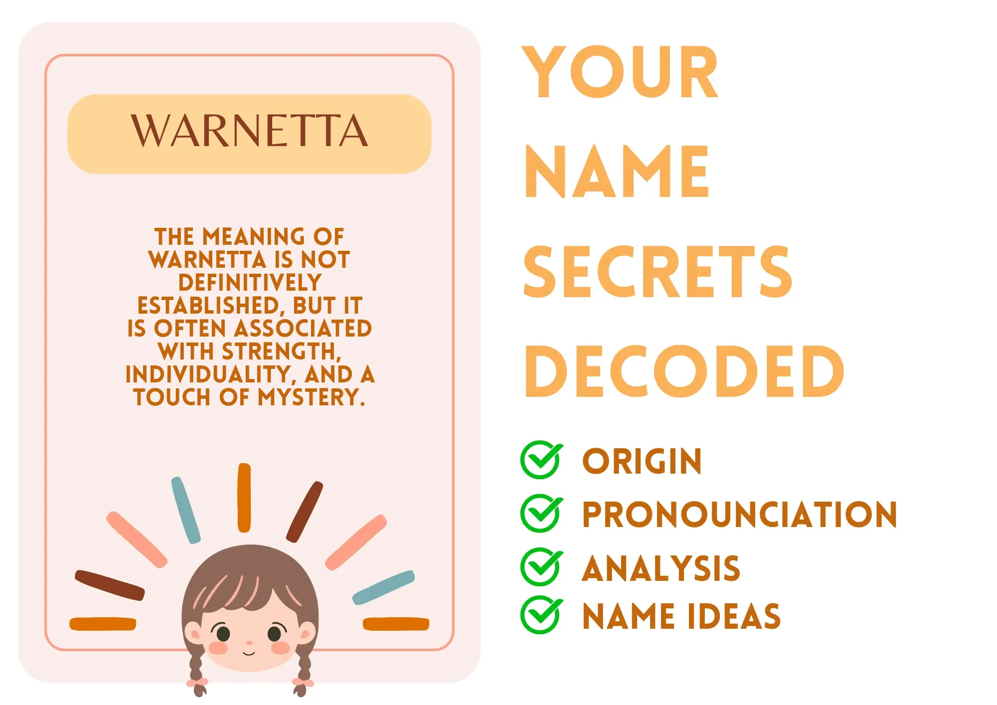Meaning: The meaning of Warnetta is not definitively established, but it is often associated with strength, individuality, and a touch of mystery.