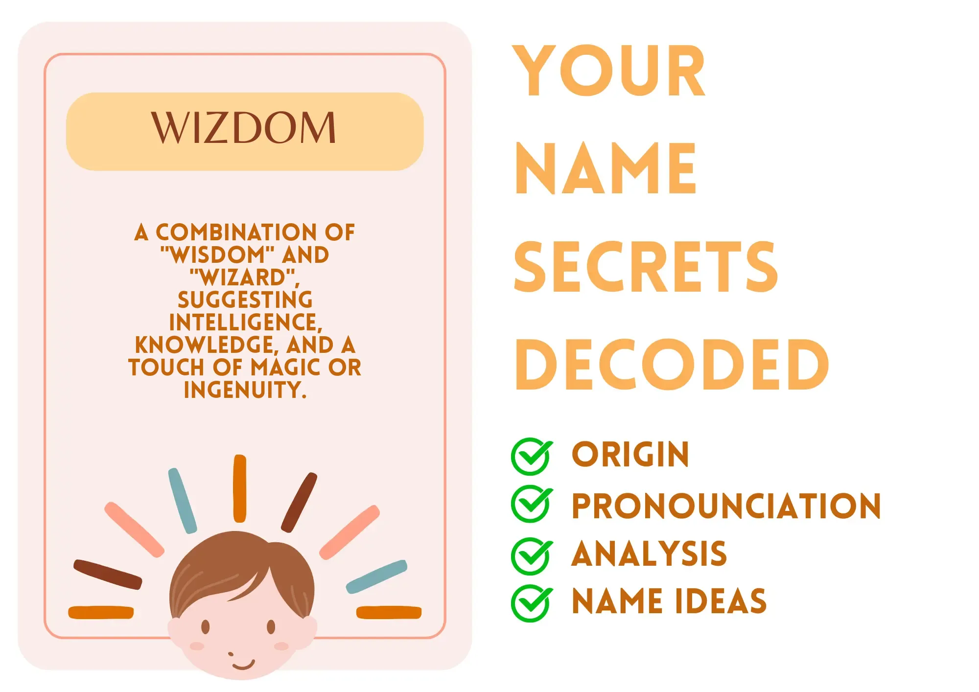Have you ever wished you could mix brainpower with a dash of magic? That’s where Wizdom comes in! With a name like this, you embody a fantastic combination of wisdom and wonder. You’re not just a thinker; you’re a creative problem-solver, ready to sprinkle a little magic into whatever you do. So, if you feel a spark of excitement whenever you tackle an issue, that's no coincidence—it's just your name working its charm!